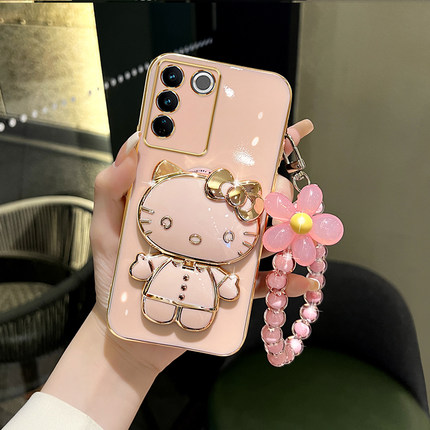 适用vivos17手机壳女款s16pro可爱猫咪补妆镜支架s17e保护套s15/s12硅胶s10/s9/s7/s6/s5防摔粉色小清新