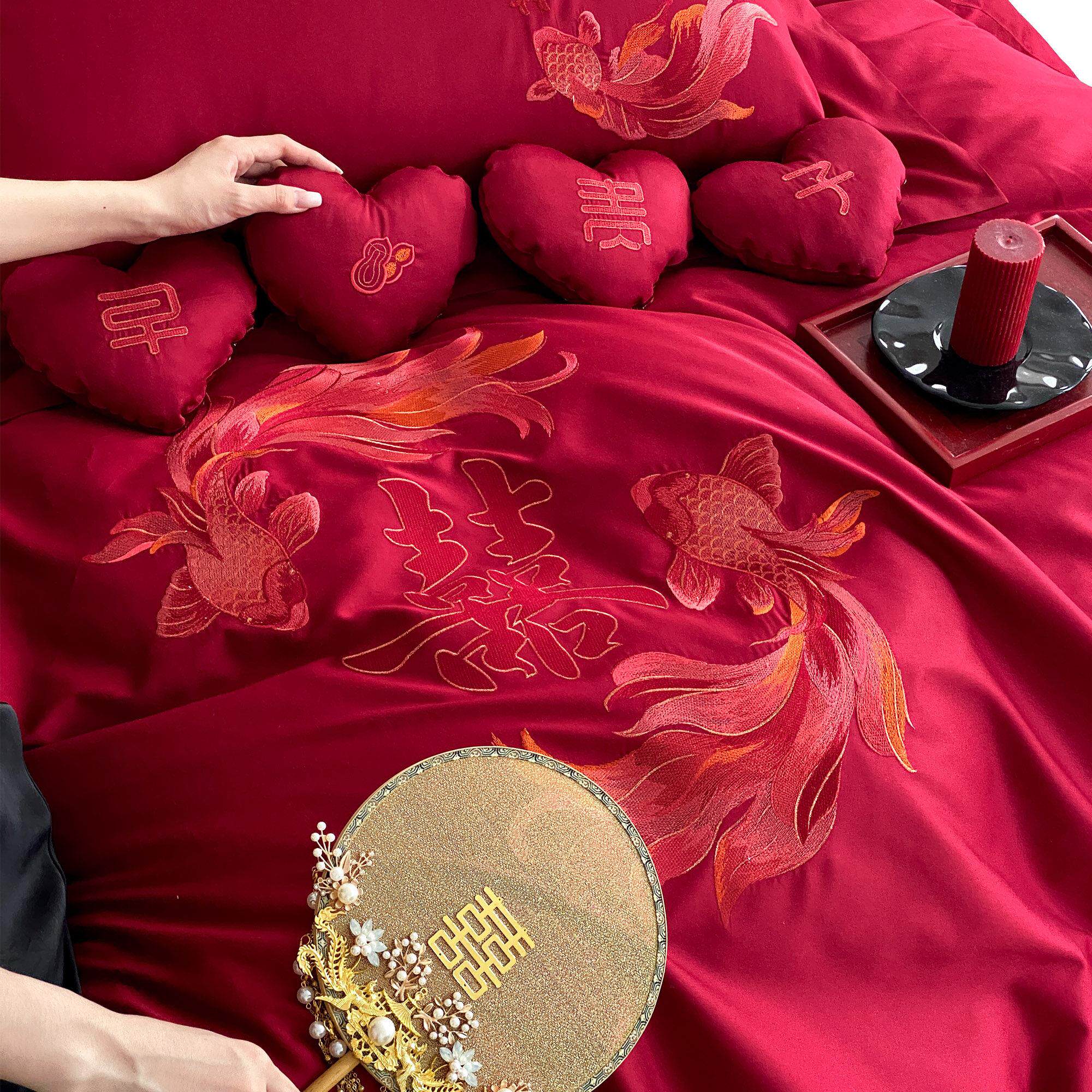 早生贵子锦鲤刺绣全棉婚庆件套NBP套红四色长绒棉结婚被1床单.8床