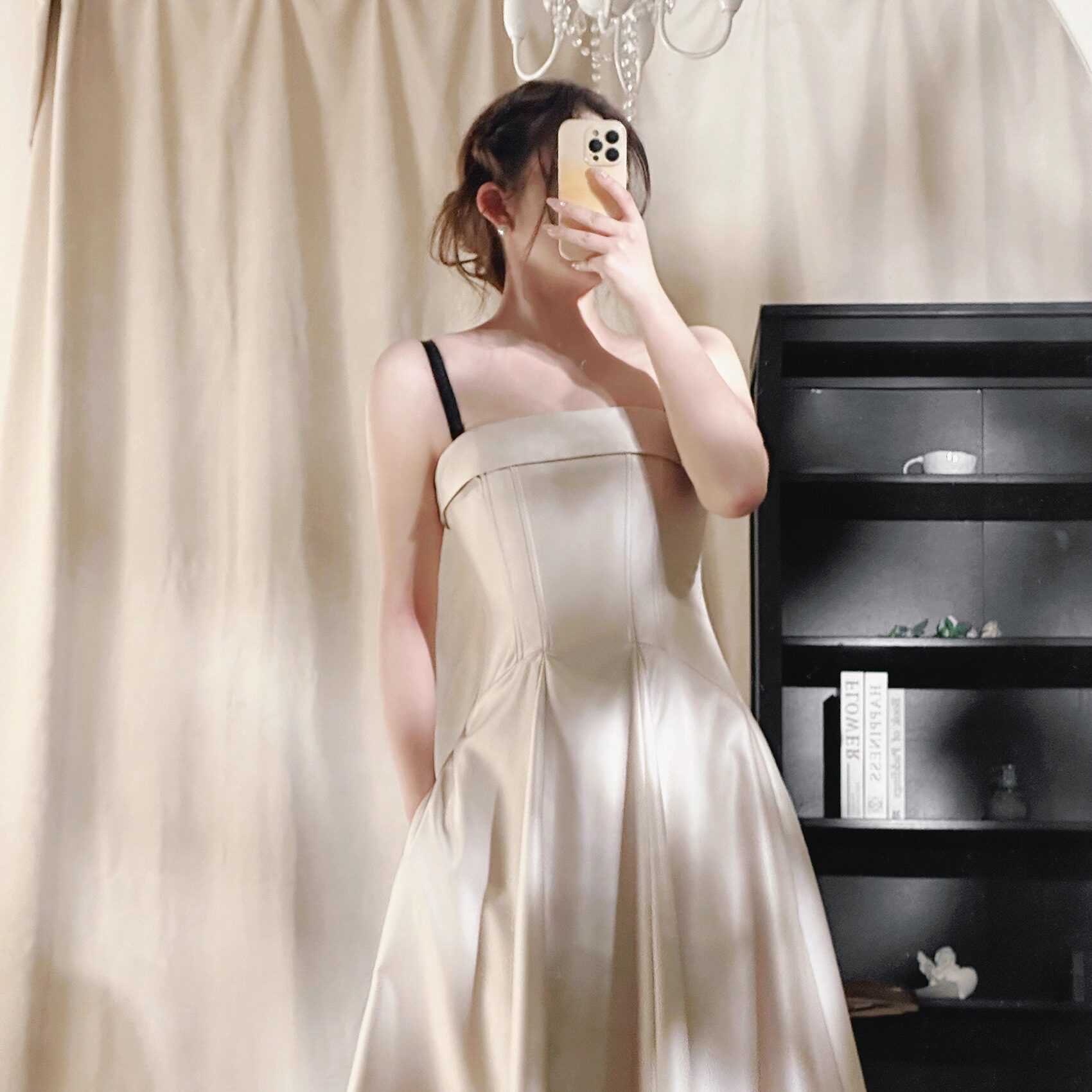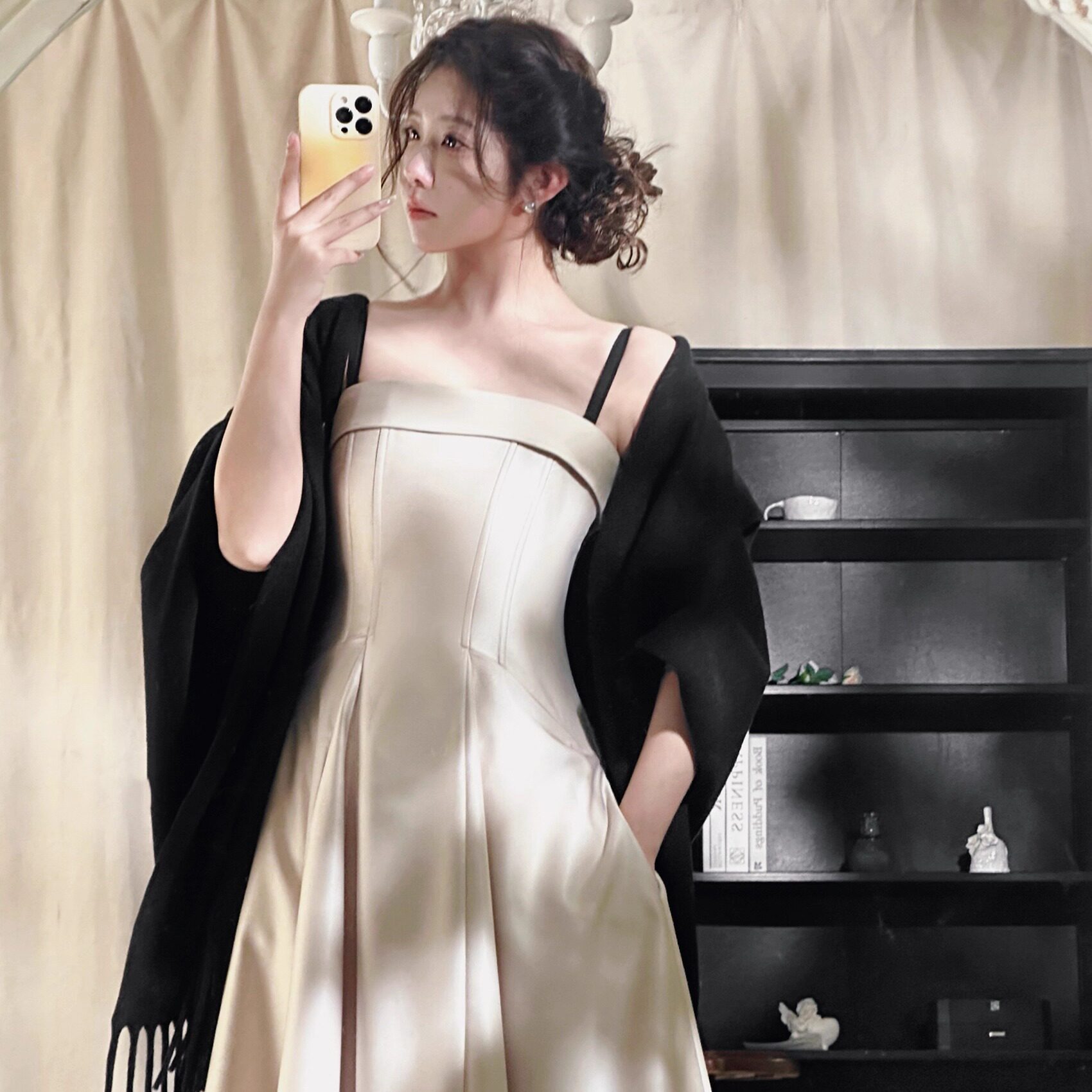 黑茉莉与甜酒 月若流金 高级精致鱼骨吊带抹胸小礼服裙+流苏披肩