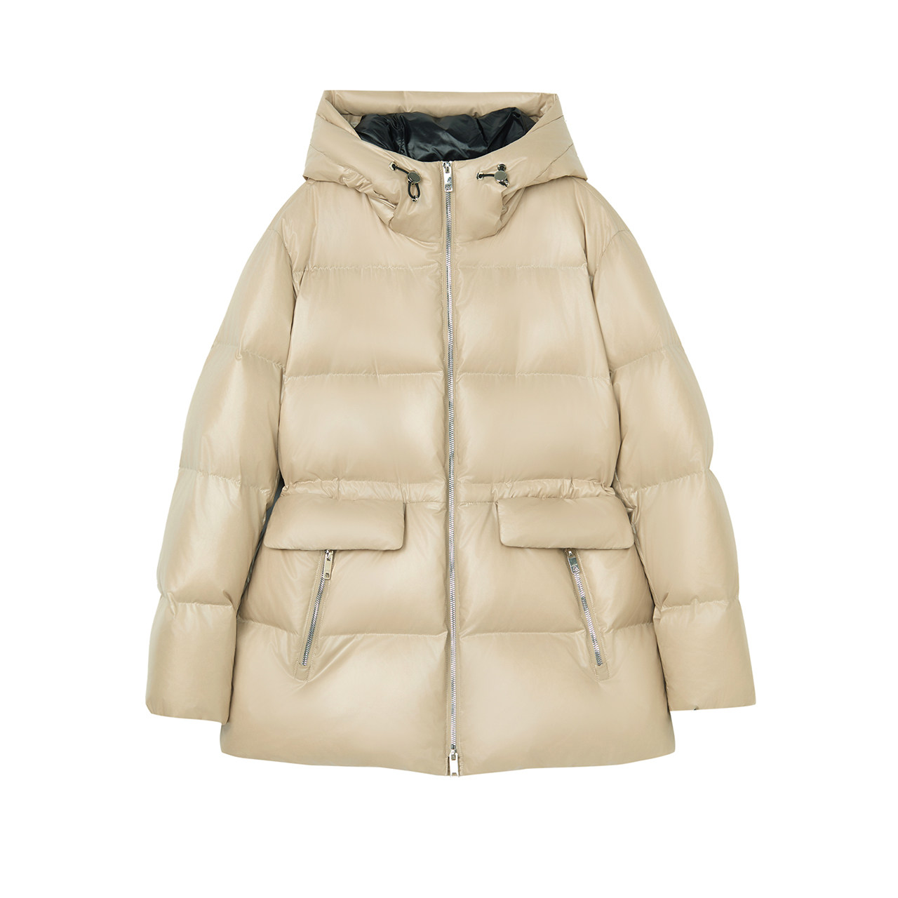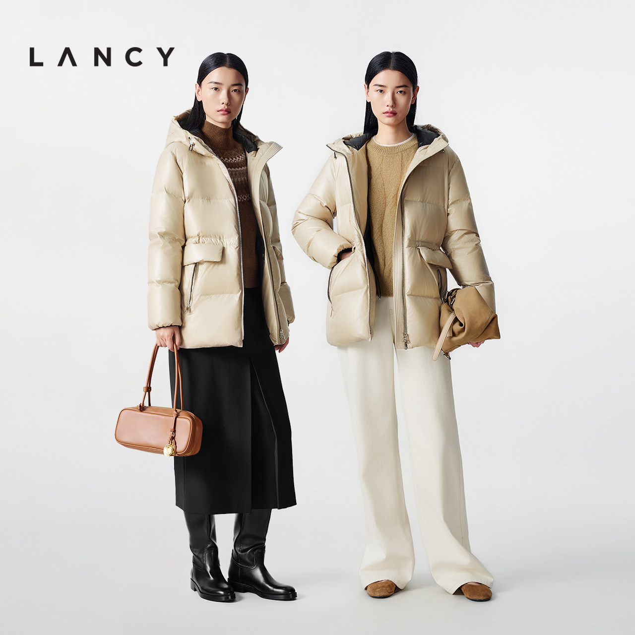 【匈牙利白鹅绒】LANCY/朗姿2025冬季新款亮面连帽收腰中长羽绒服
