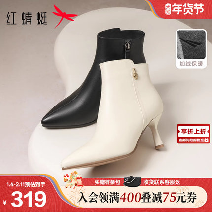 红蜻蜓高跟鞋冬季新款女鞋靴子细跟女士鞋子真皮白色尖头皮鞋女靴