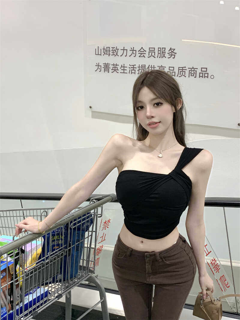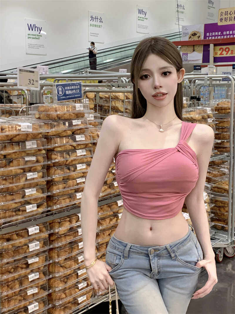 甜辣妹单肩吊带小背心女主播夏季褶皱露锁骨性感内搭外穿短款上衣