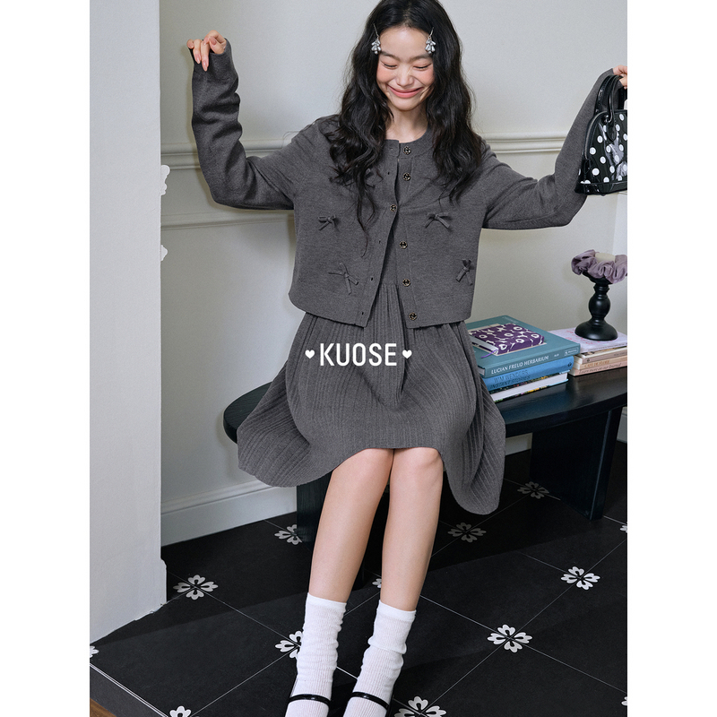 阔色针织衫开衫背心裙两件套装25秋季新款女上衣毛衣连衣裙短裙灰