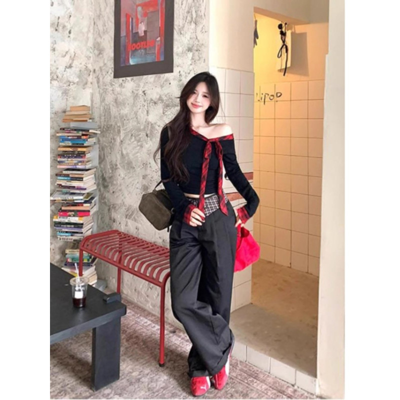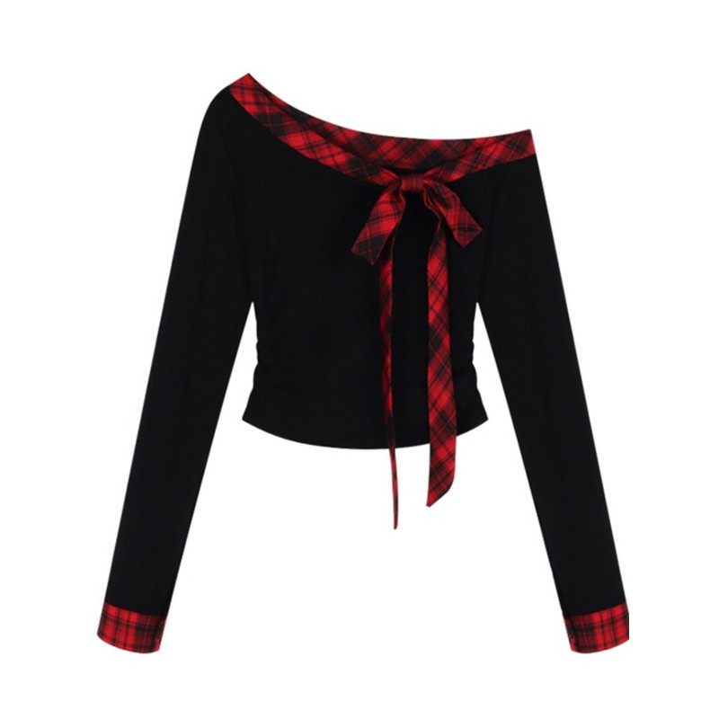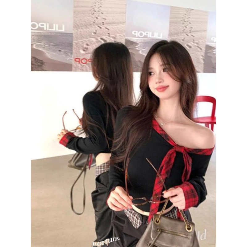 大码纯欲辣妹撞色格纹斜肩长袖女
