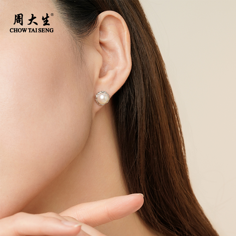 周大生满镶淡水珍珠耳钉女加厚s925银耳饰养耳洞时尚设计款精致