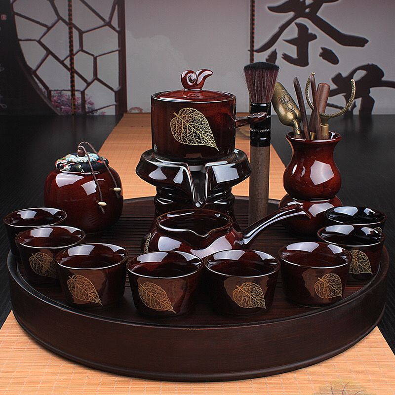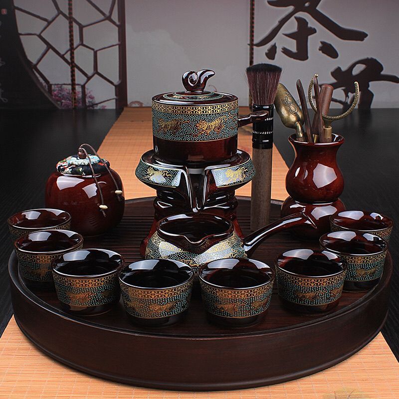 懒人石磨茶具套装家用重竹茶盘功夫陶瓷紫砂杯洗自动烧水茶壶整套