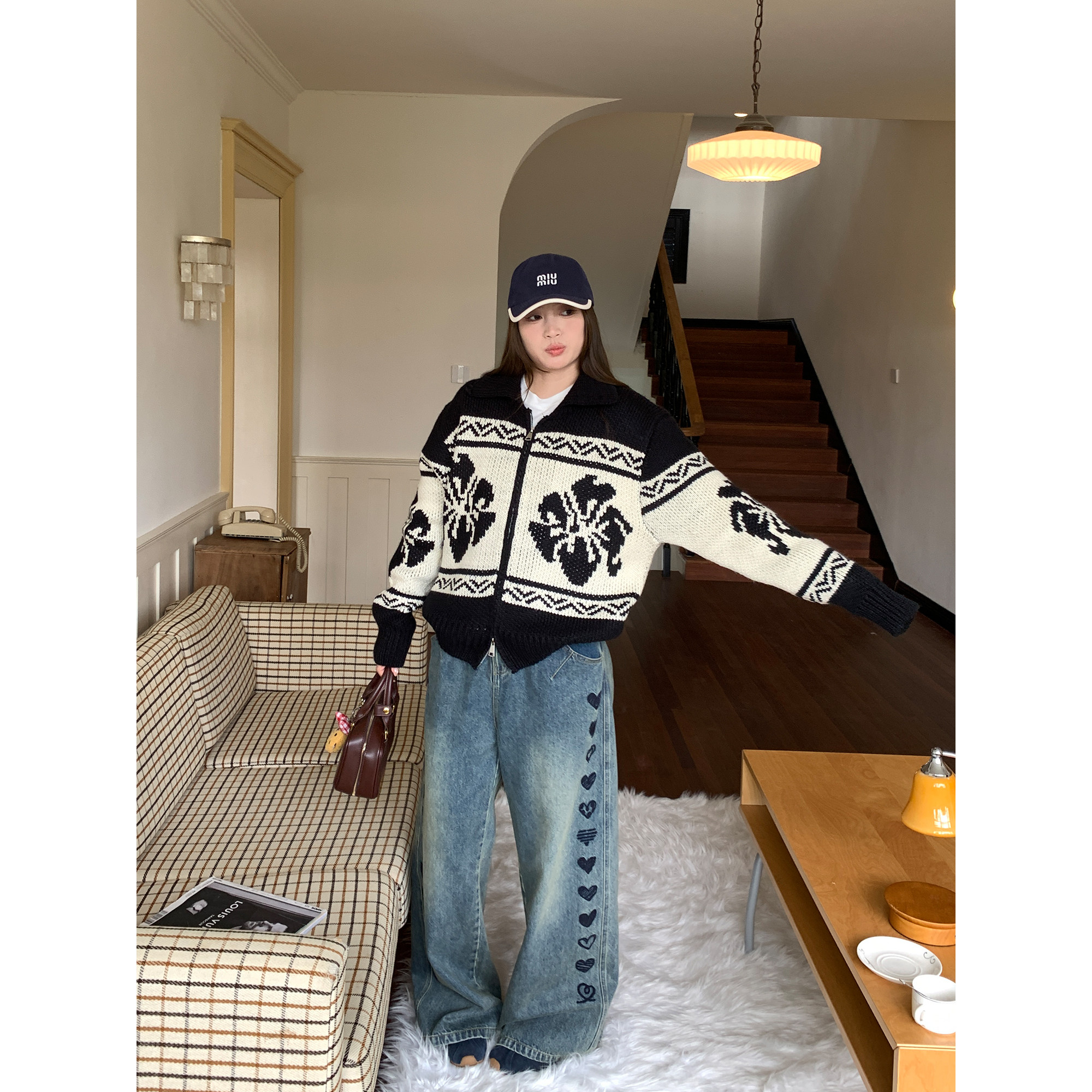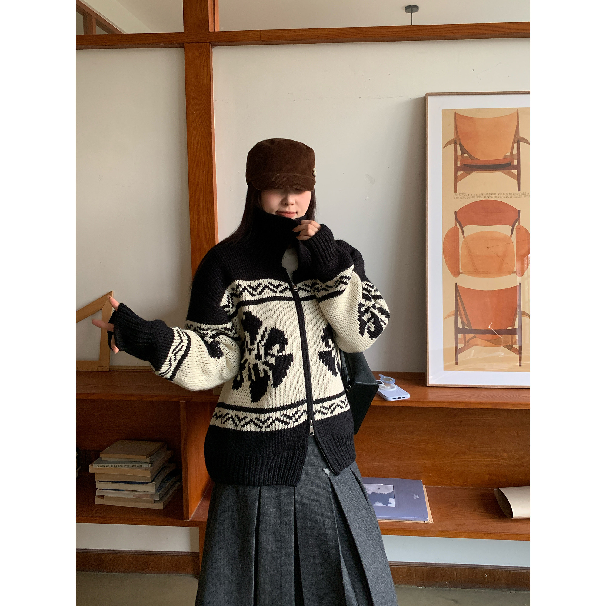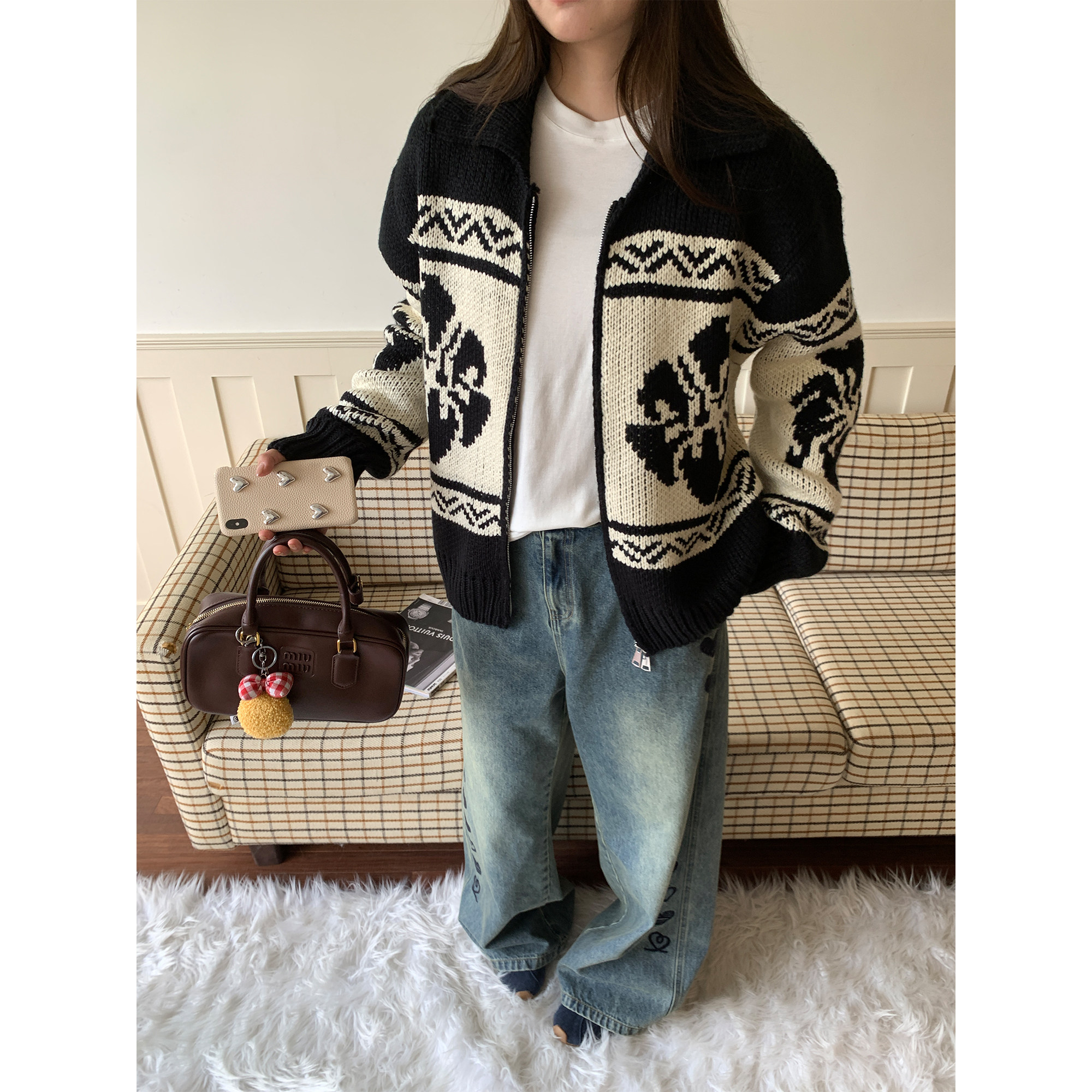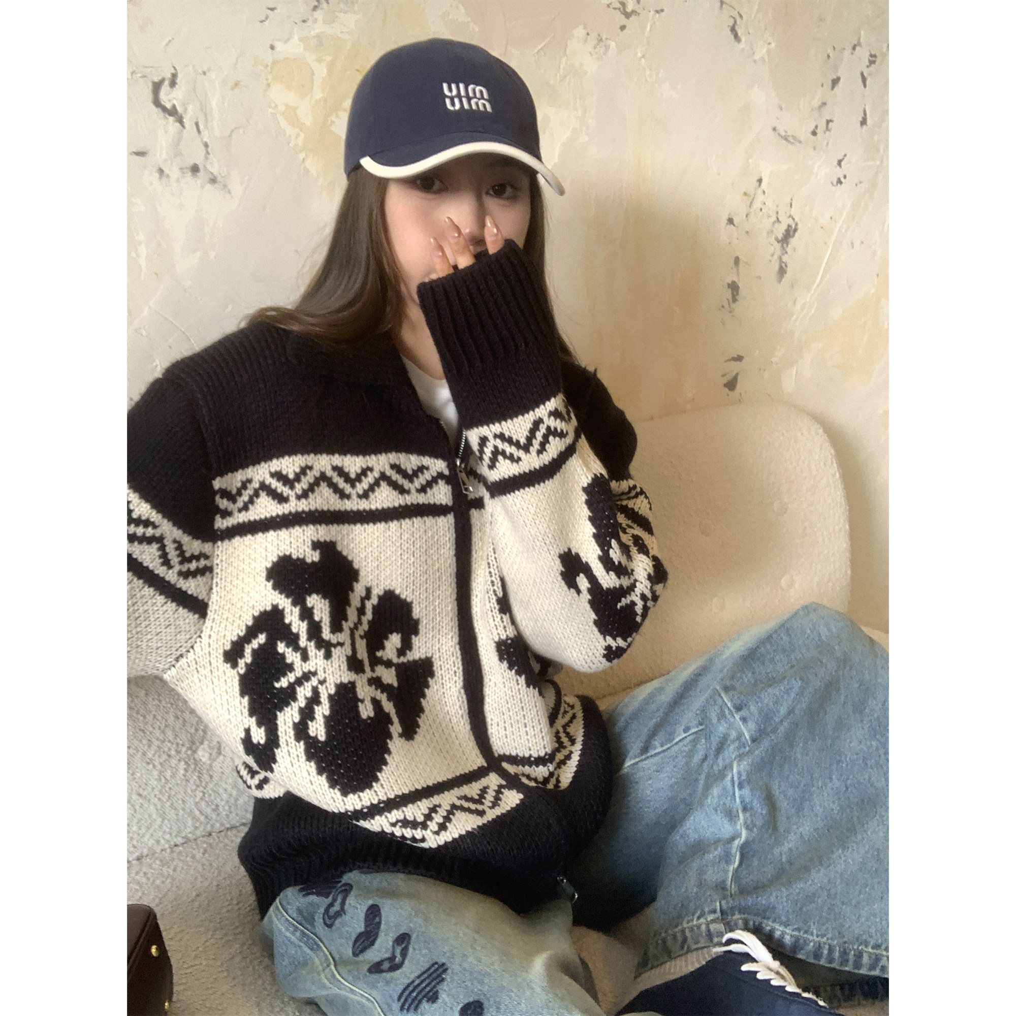 NAZ那子大码特色撞色花朵针织外套胖mm时尚慵懒雪花纹拉链毛衣冬