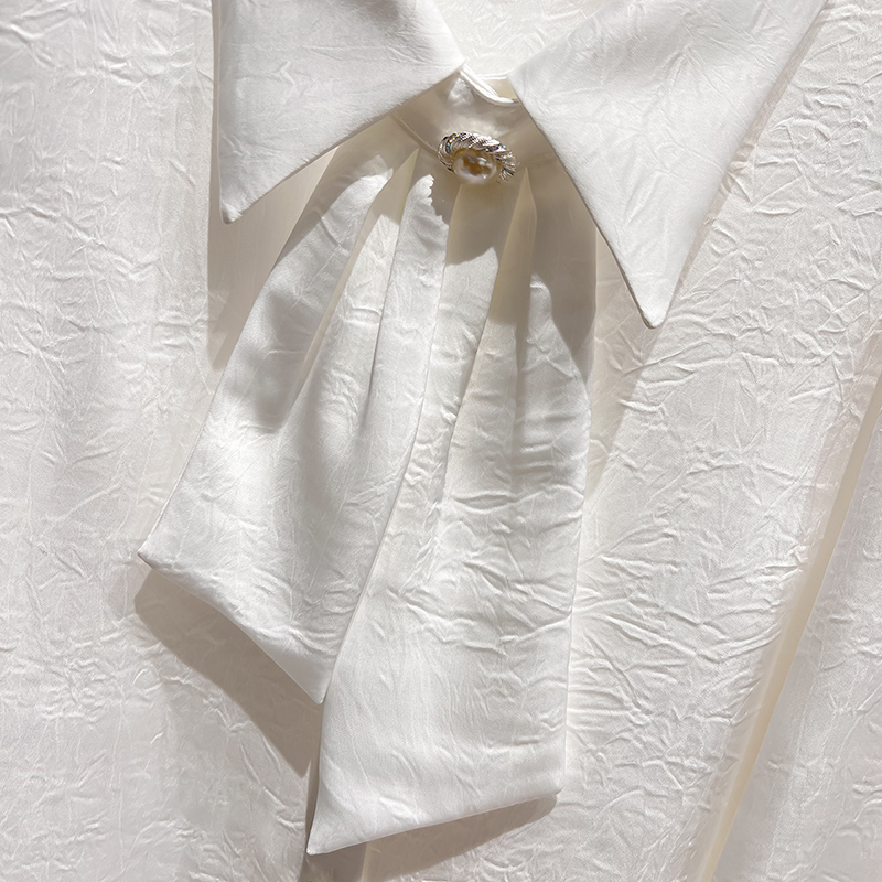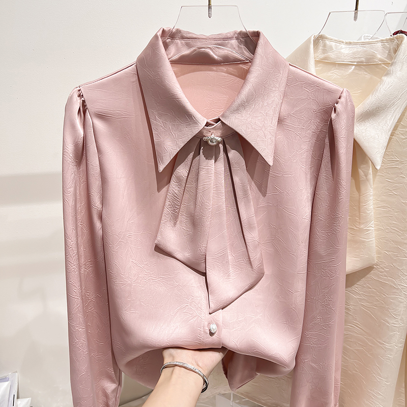 2024新款法式气质显瘦翻领领结浮雕长袖雪纺衬衫女春季薄款上衣