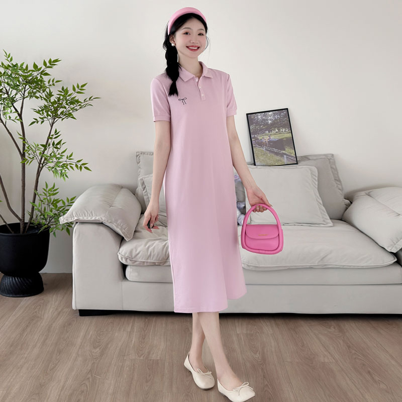 孕妇连衣裙2025新款深蓝色Polo领短袖薄款时尚宽松显瘦中长款夏季