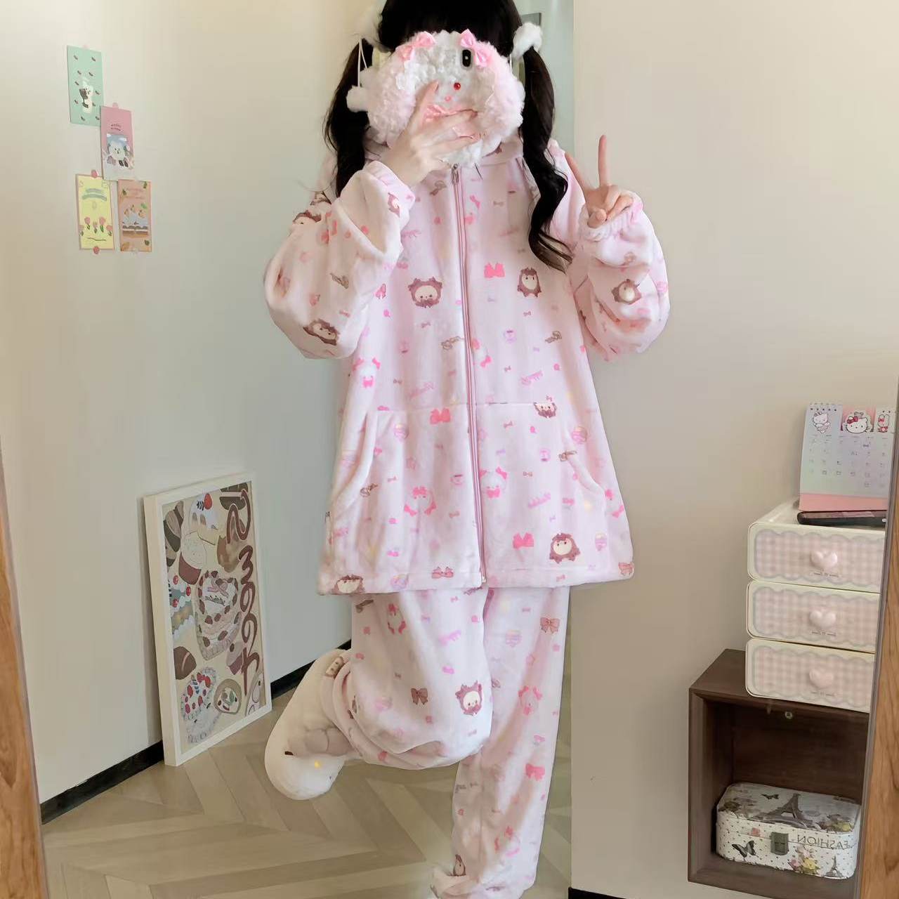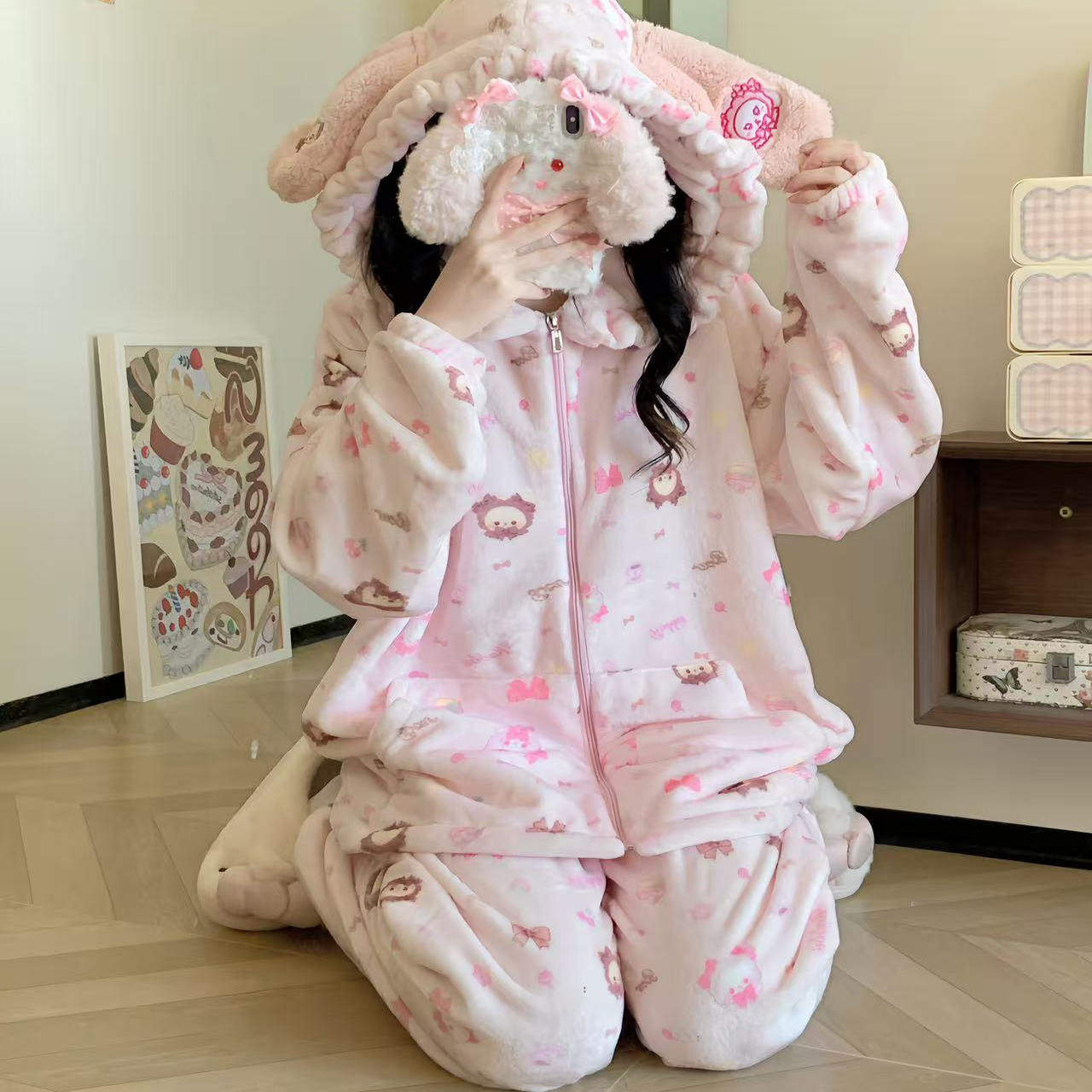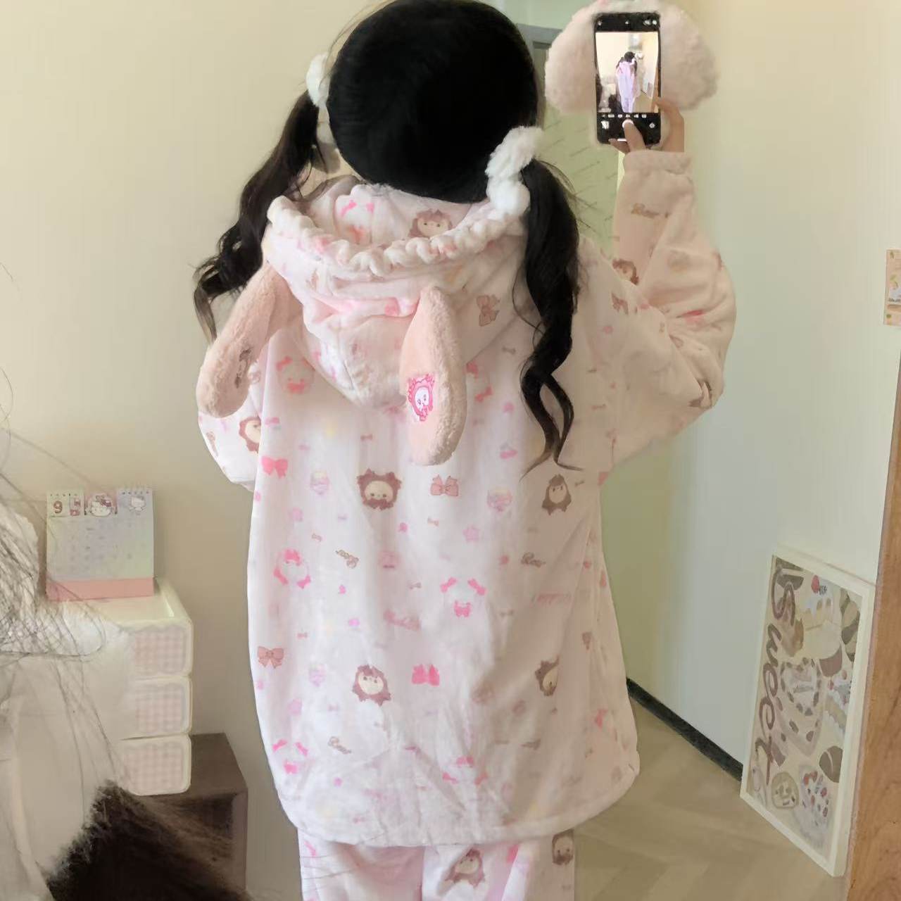 原创!冬季新款兔熊卡通法兰绒甜妹睡衣女可爱学生加绒加厚家居服