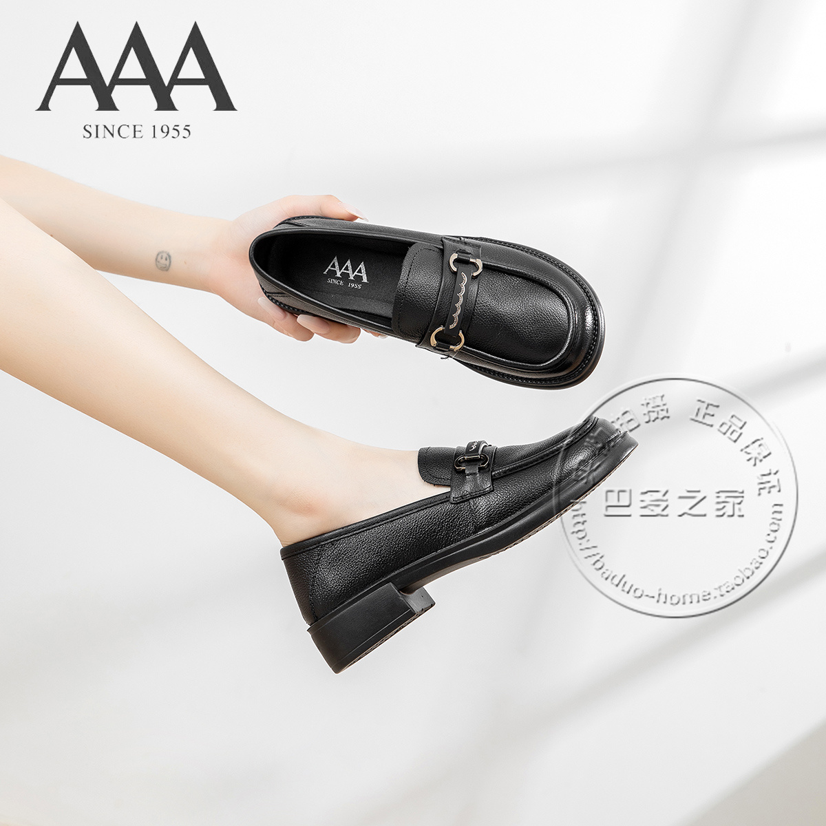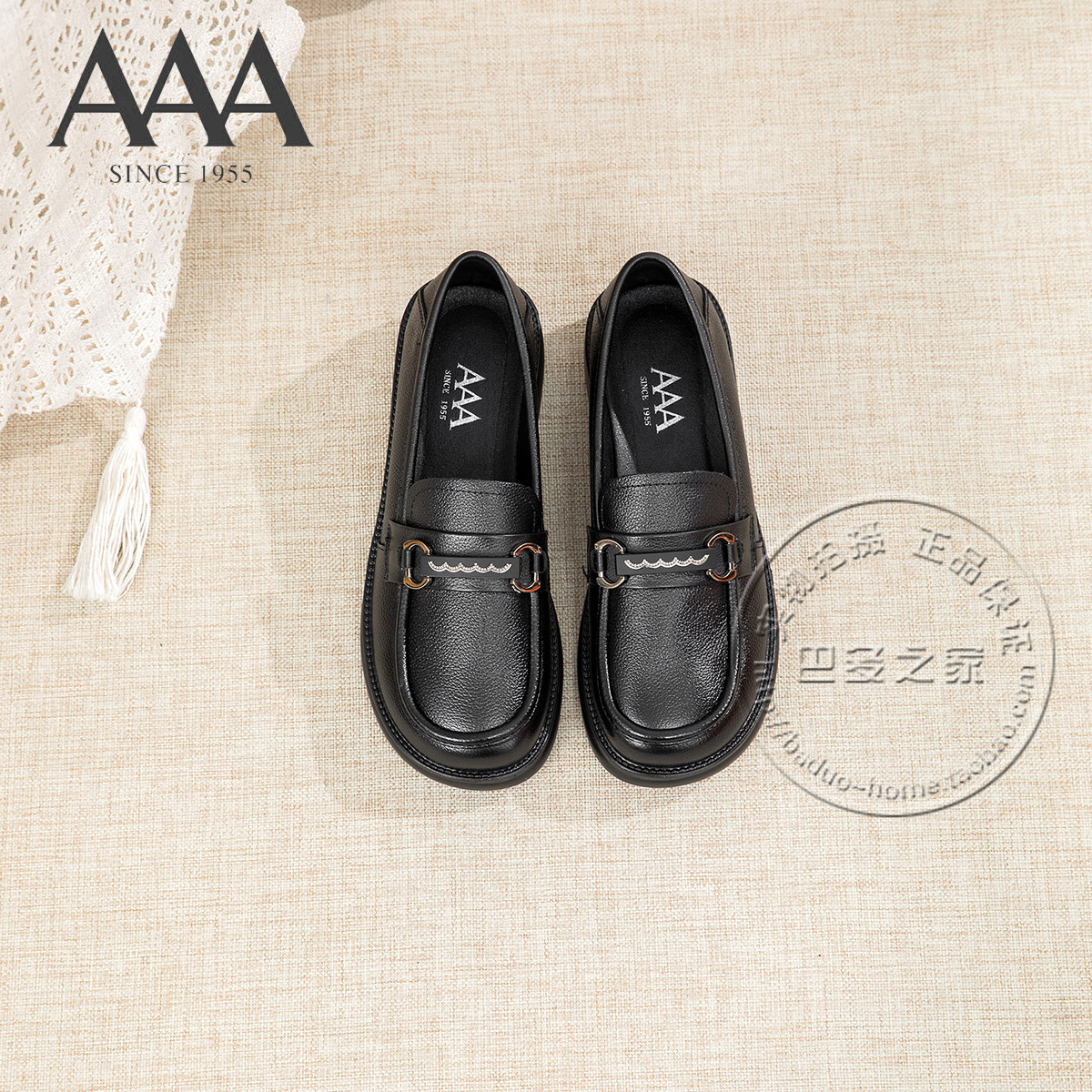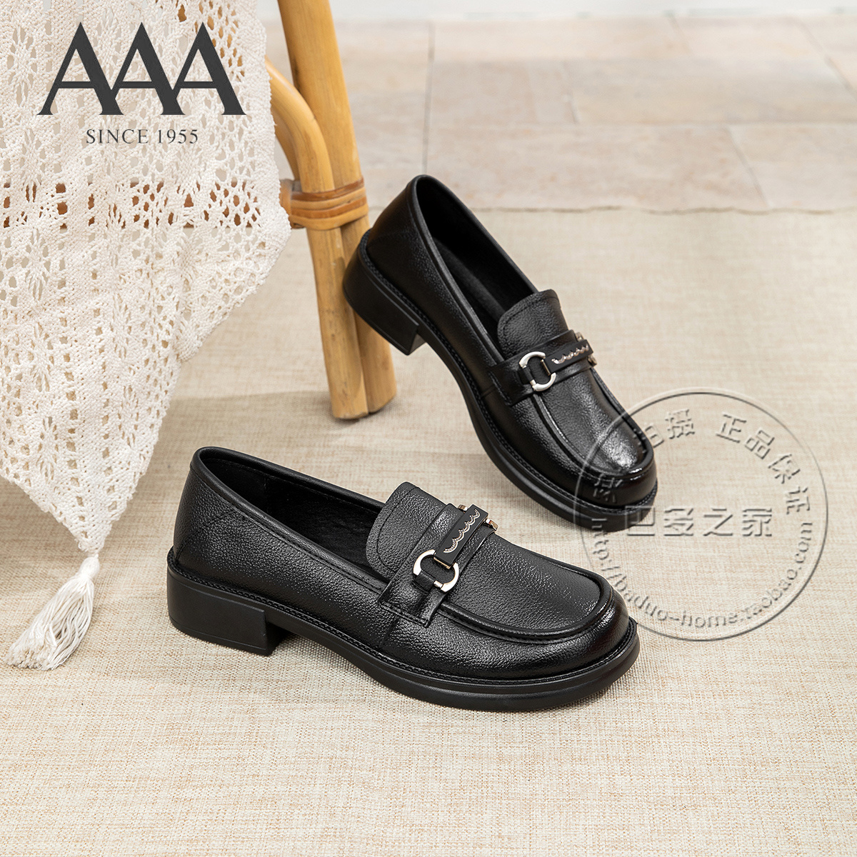 AAA女鞋牛皮纳帕橘皮纹金属扣低跟乐福鞋英伦风真皮黑色中口单鞋