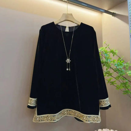 大码女装花朵边长袖丝绒上衣