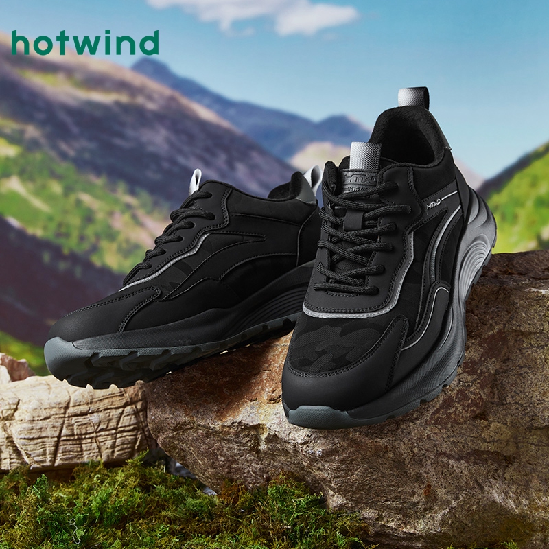 热风冬季新款男士百搭黑色运动休闲鞋加绒保暖厚底板鞋男鞋