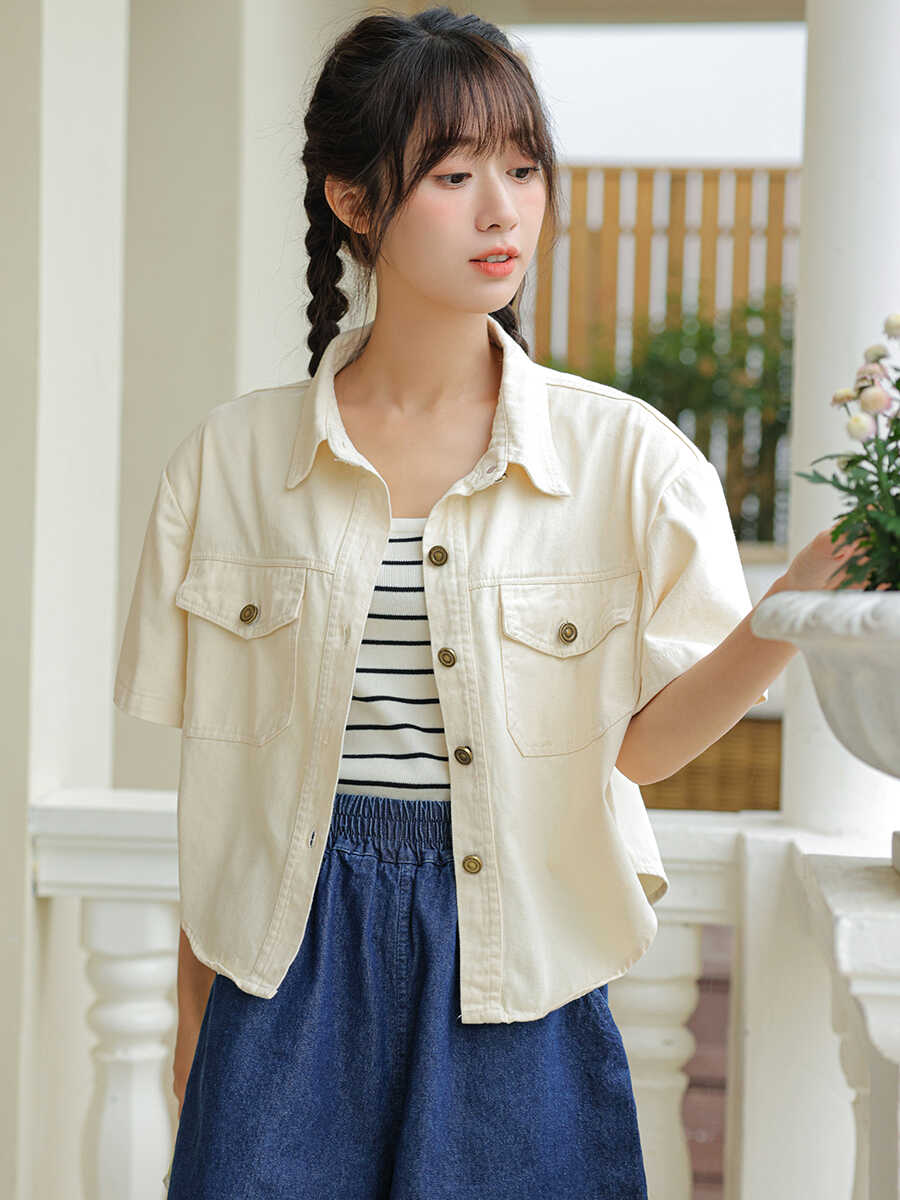 白色短款牛仔外套女2024夏季新款小个子宽松百搭薄款短袖衬衫外套