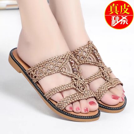 青蕴真皮拖鞋女外穿2025年新款夏季平底百搭时尚编织沙滩鞋凉拖鞋