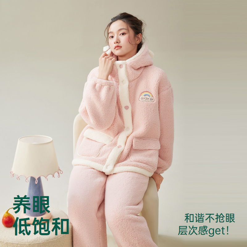 安之伴珊瑚绒连帽秋冬季睡衣女款大码宽松甜美可爱家居服保暖套装