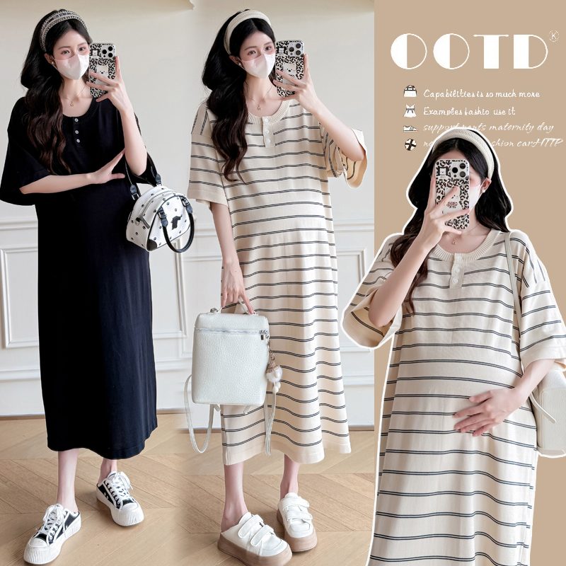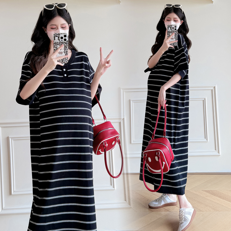 大码孕妇连衣裙2025夏季女时尚中长款条纹冰丝宽松气质显瘦200斤