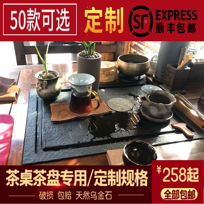 茶桌茶盘中间嵌入式乌金石大理石火烧石漏水盖板面板内嵌定制定做