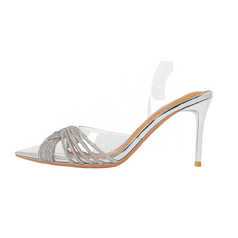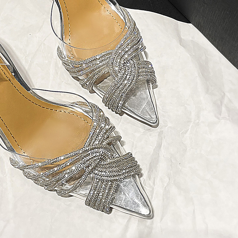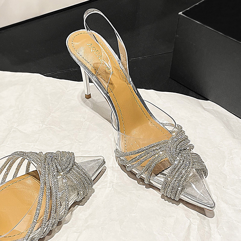林向晚 梦中情鞋~银色高跟鞋设计感小众名媛风包头透明水钻凉鞋女