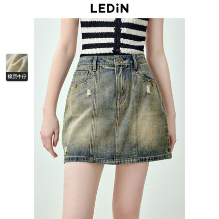乐町铆钉牛仔短裙夏季新款废土风水洗牛仔半身裙破洞A字裙