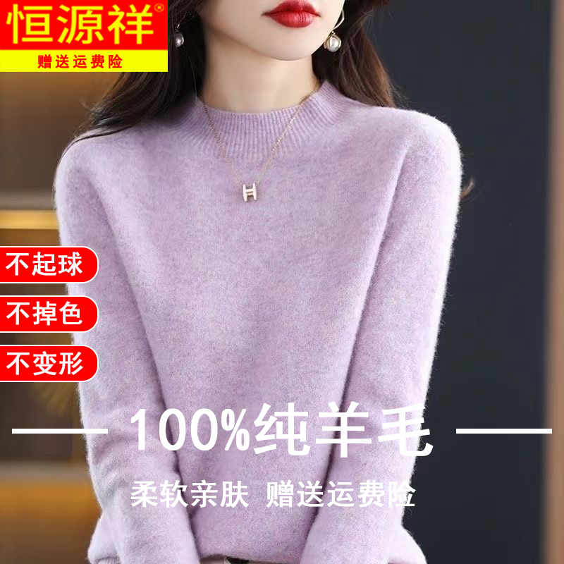 恒源祥女士100%羊毛衫秋冬宽松内搭针织衫毛衣半高领加厚打底衫