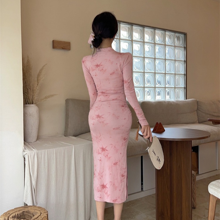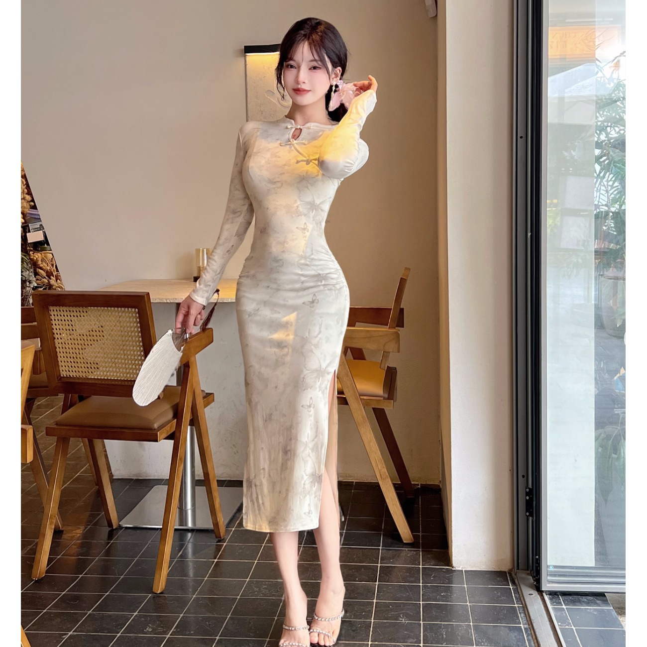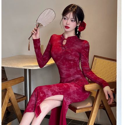 新中式复古红色改良旗袍女早秋高级感立领盘扣开叉修身显瘦连衣裙