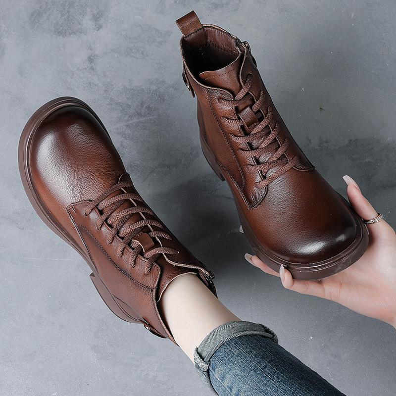 真皮马丁靴女粗跟系带英伦风短靴