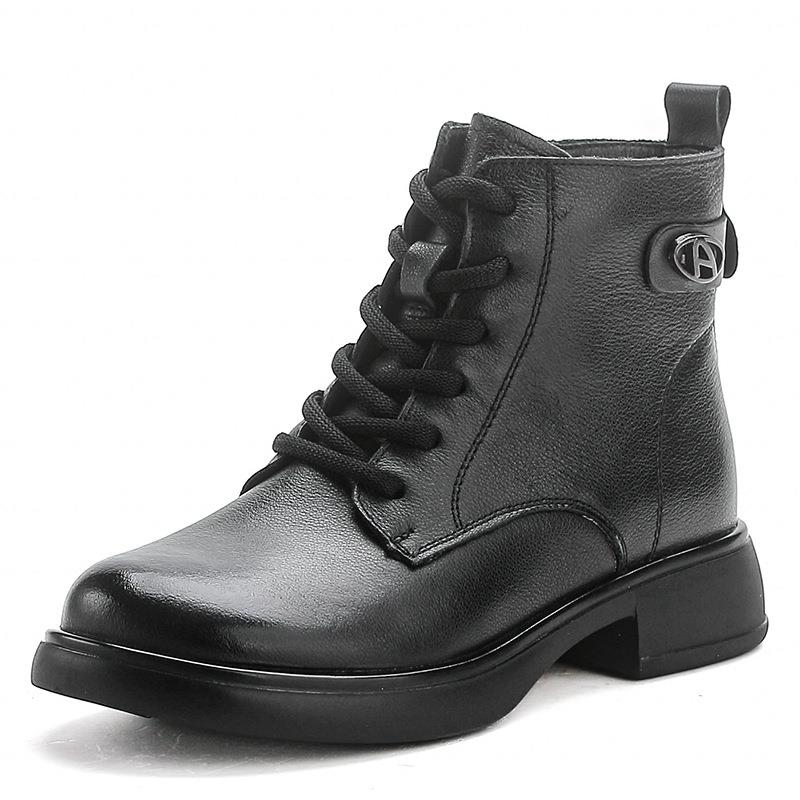 女士头层牛皮靴子加绒粗跟马丁靴女中跟学院风系伦风带英真皮短靴