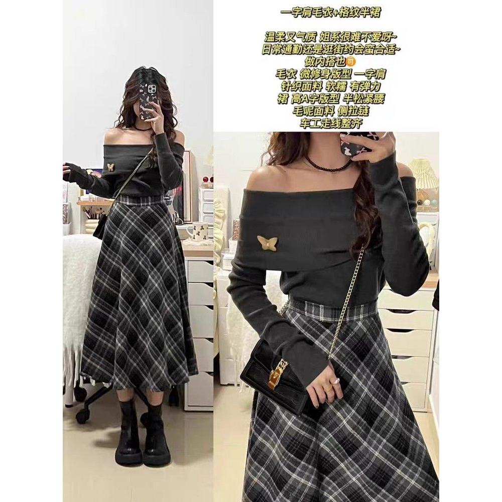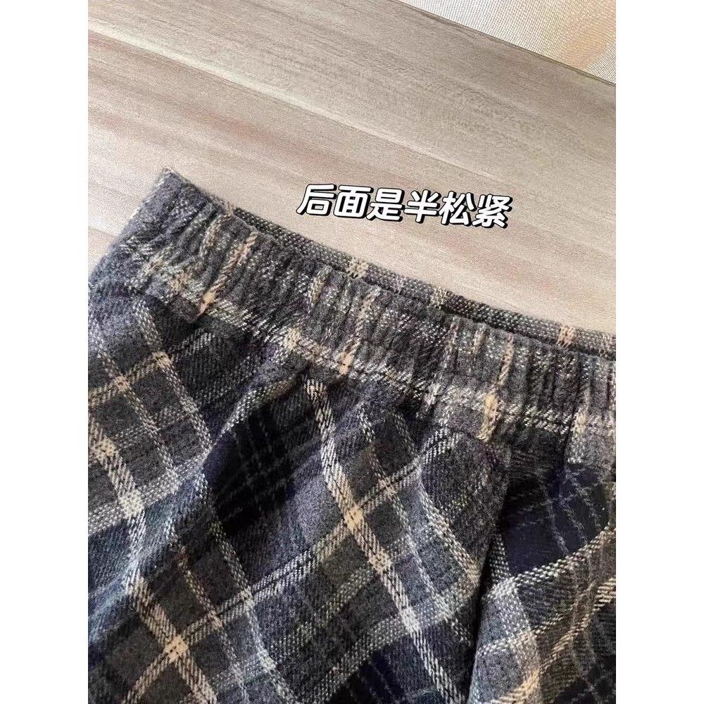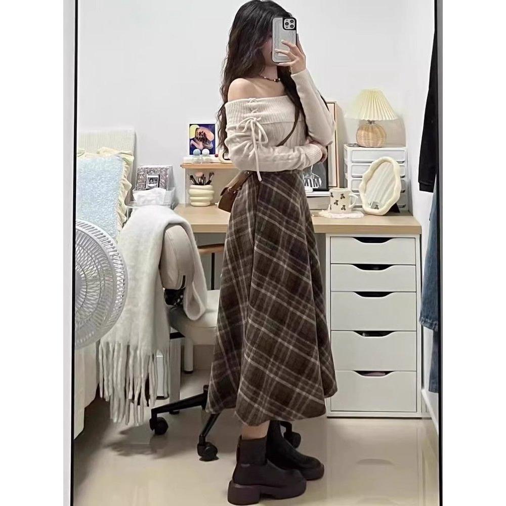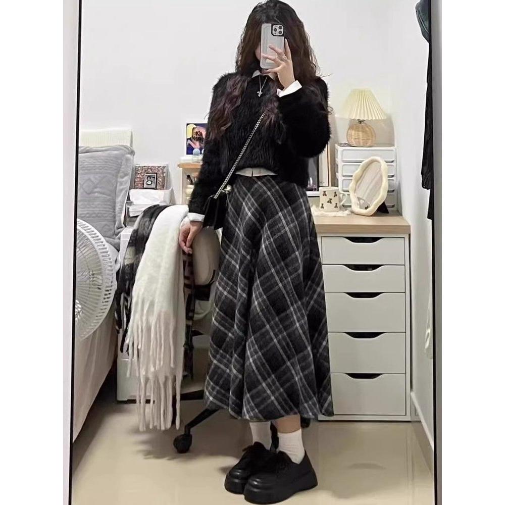 毛呢格子半身裙女秋冬小个子2024新款松紧腰卡其色中长款a字伞裙