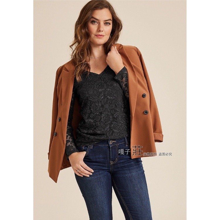 美单大码女装秋装V领长袖T恤蕾丝衫衬衫衬衣lace v neck blouse