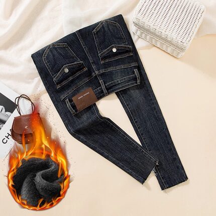 加绒加厚翻盖设计提臀高腰铅笔牛仔裤女秋冬款百搭显瘦小脚牛仔裤