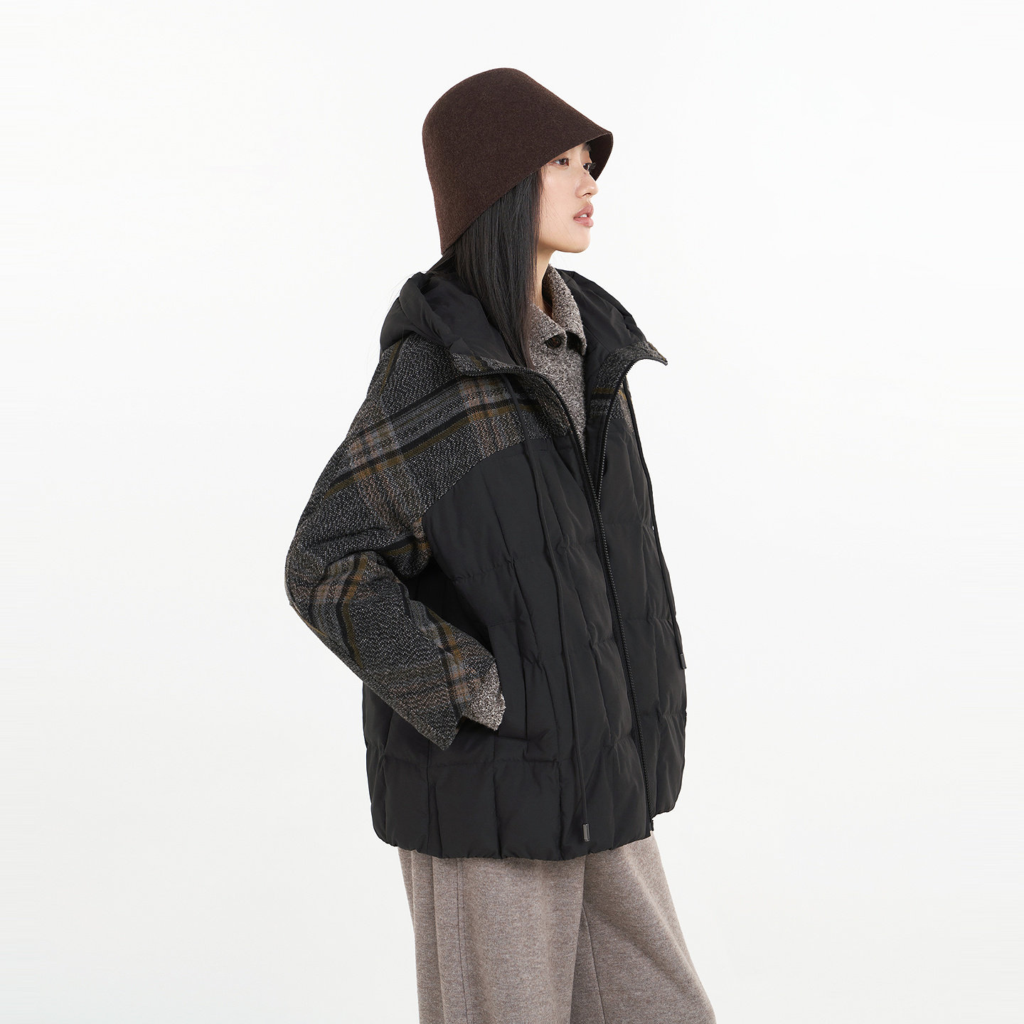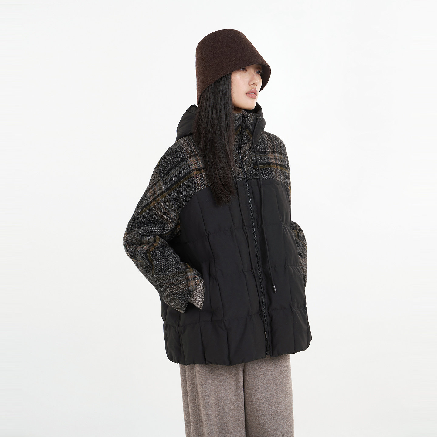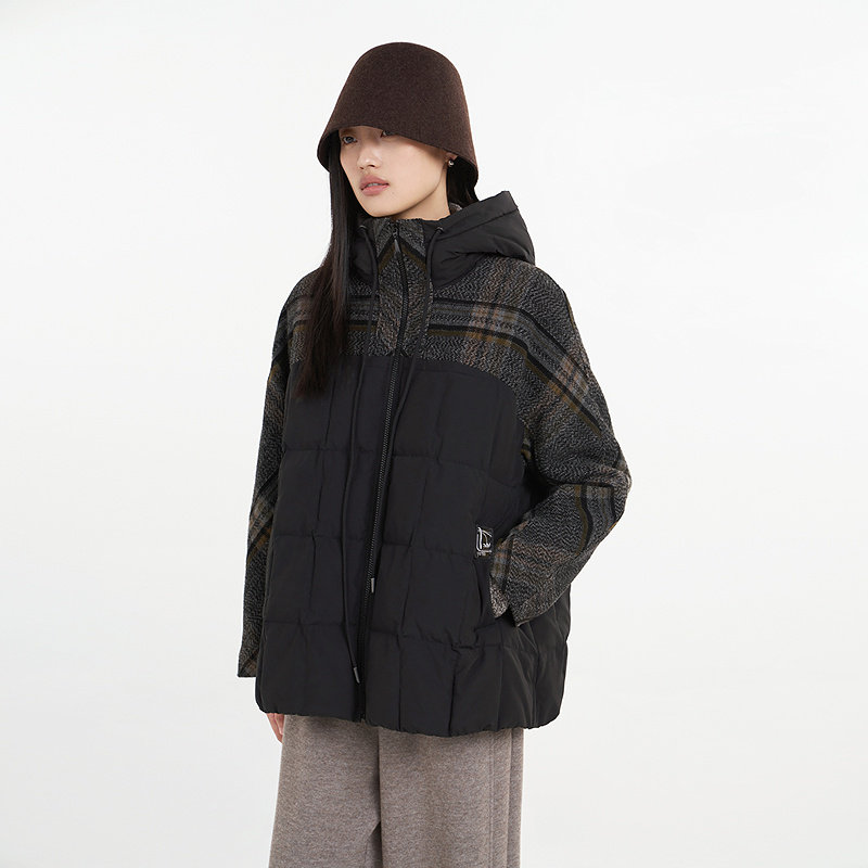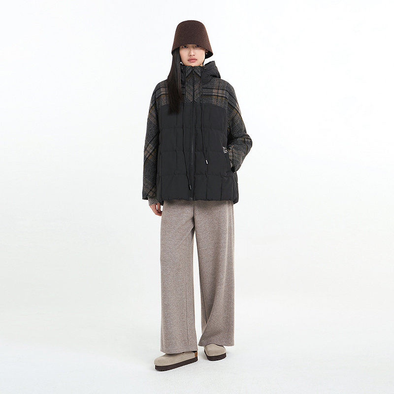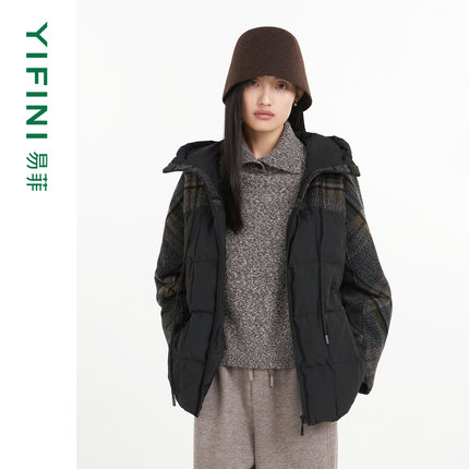 [专柜同款]Yifini/易菲针织格纹拼接白鹅绒保暖宽松中长款羽绒服
