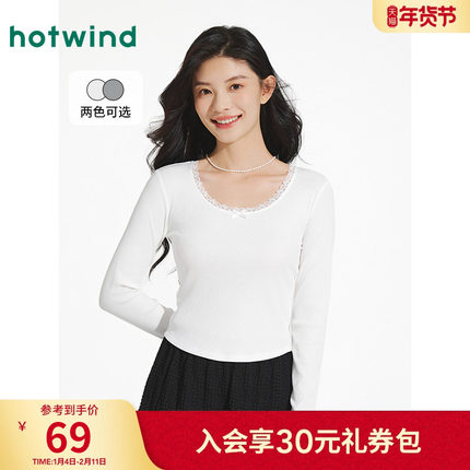 热风女士长袖T恤内搭上衣2025年秋季新款女士蕾丝U领显瘦打底衫