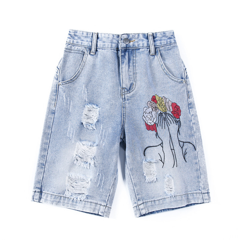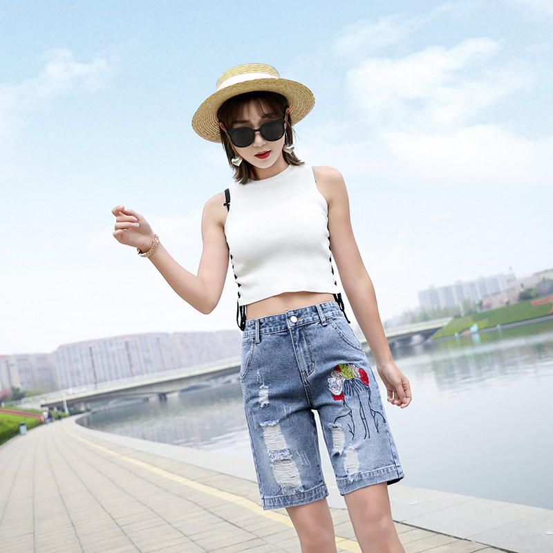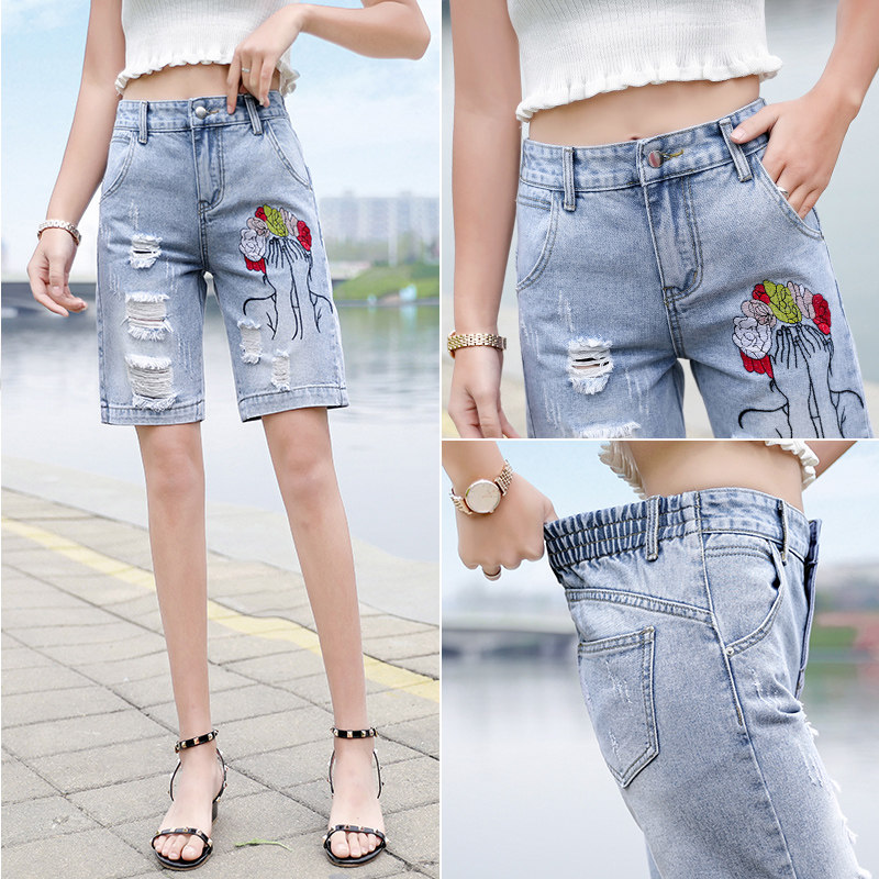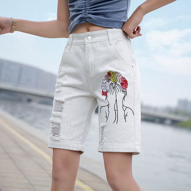 绣花牛仔短裤女五分裤高腰直筒2025夏潮新款韩版宽松休闲破洞中裤