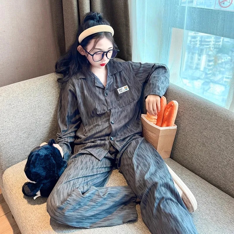 小女孩睡衣春秋款新款衬衫领长袖女童家居服套装宽松中大童空调服