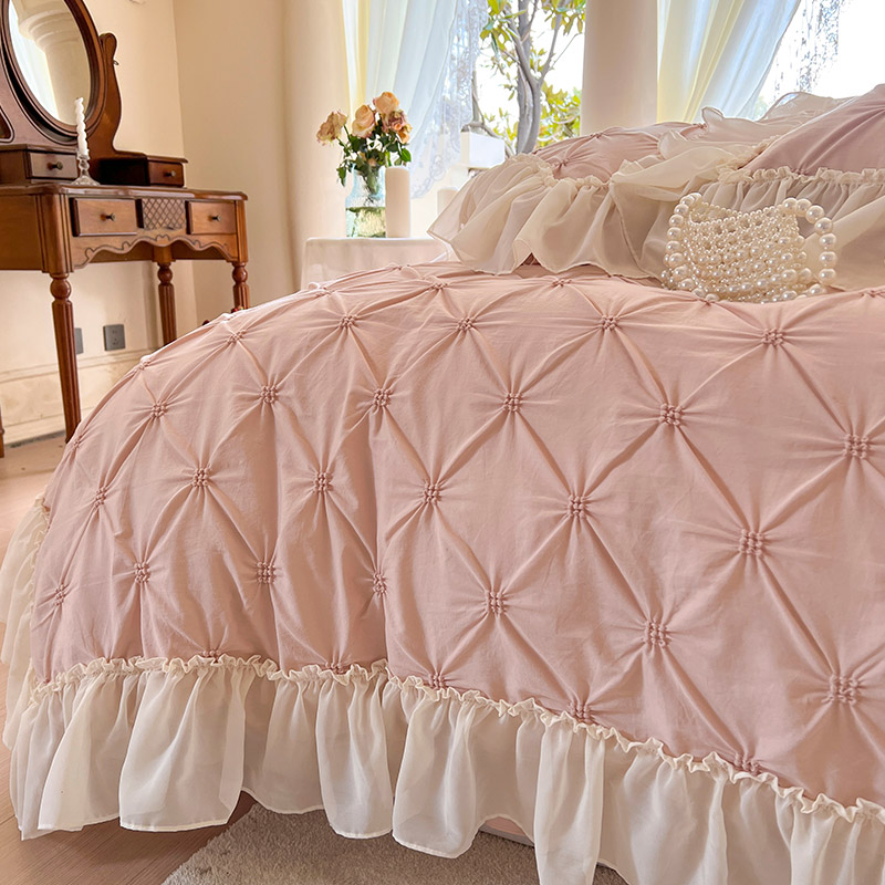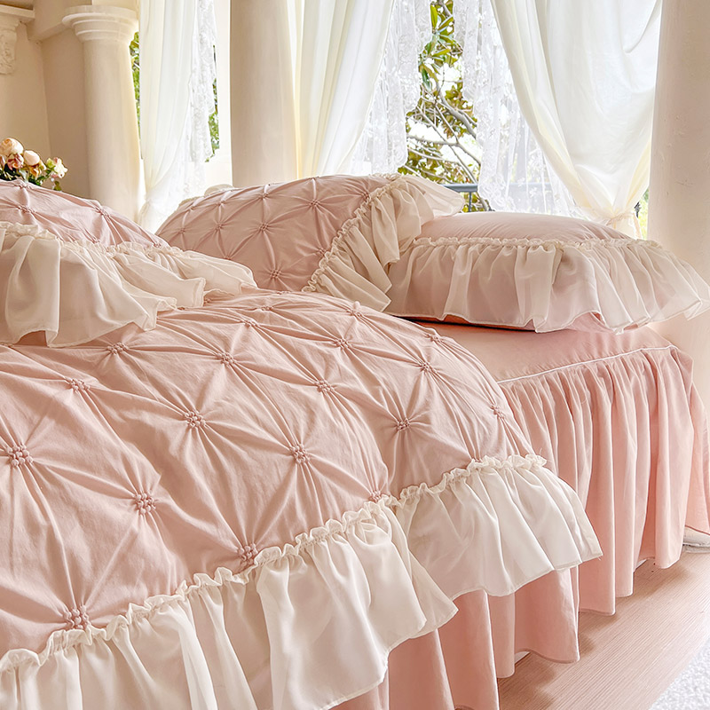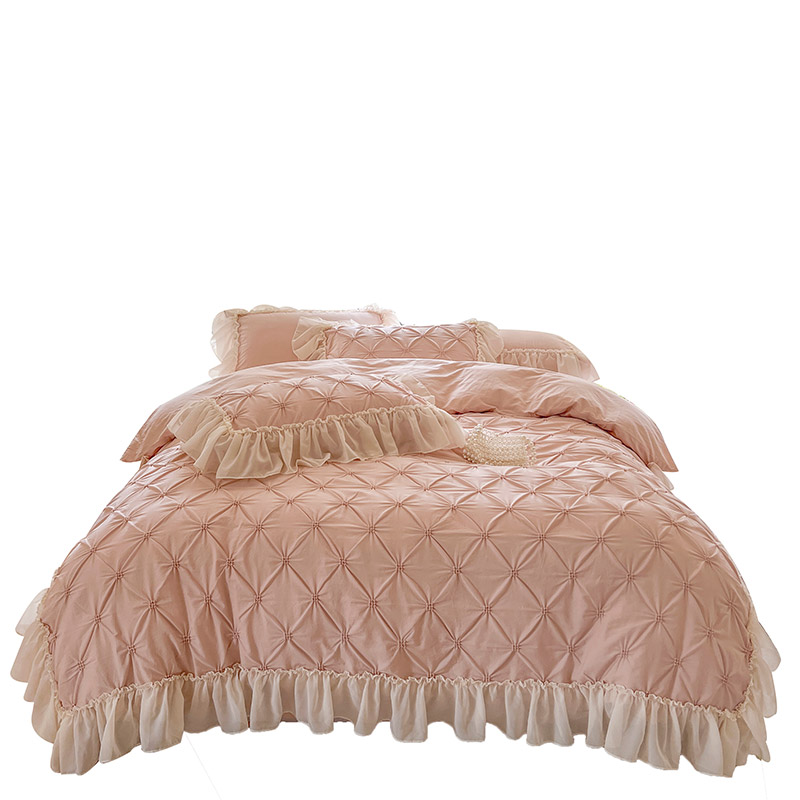 公主风全棉水洗棉四件套立体揪花纯棉床裙款被套床上用品豆沙米色