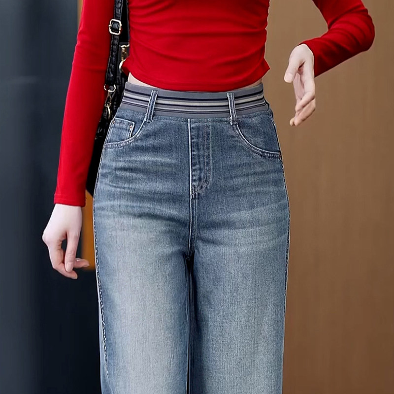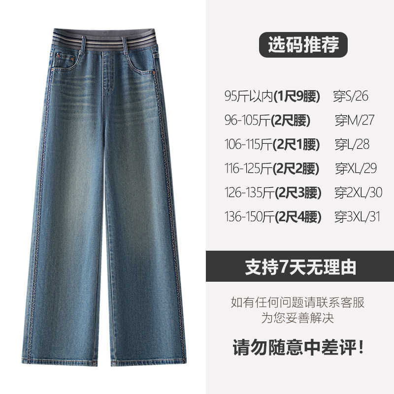 松紧腰刺绣烫钻直筒牛仔裤女宽松显瘦春秋2026年新款百搭阔腿裤子