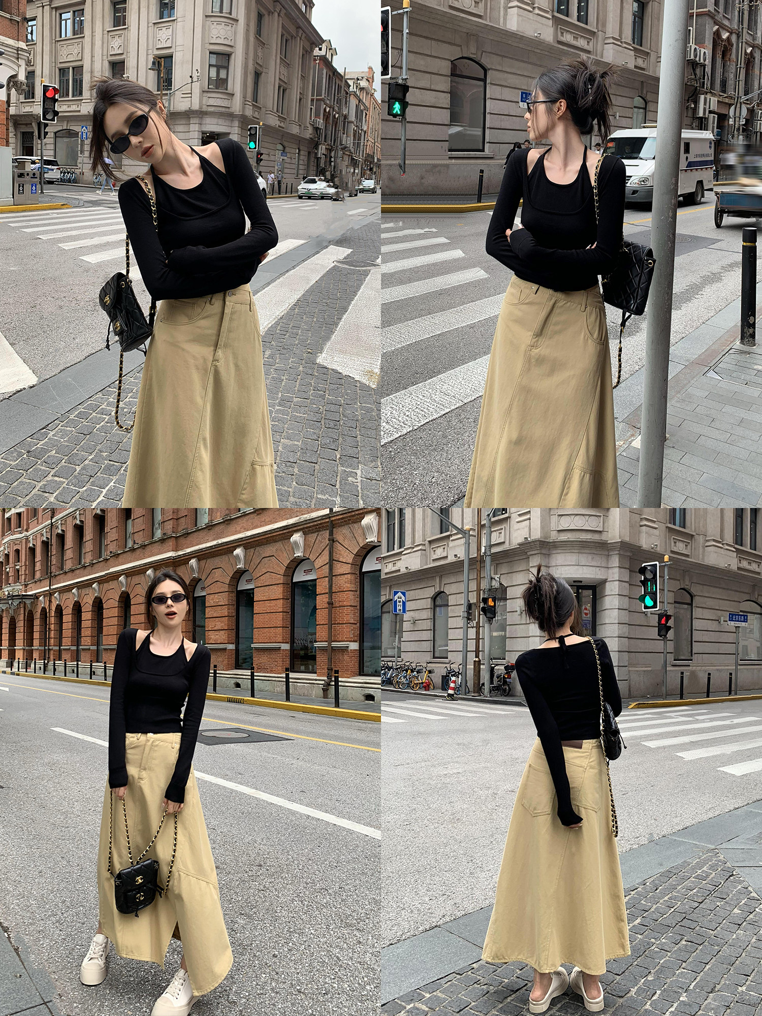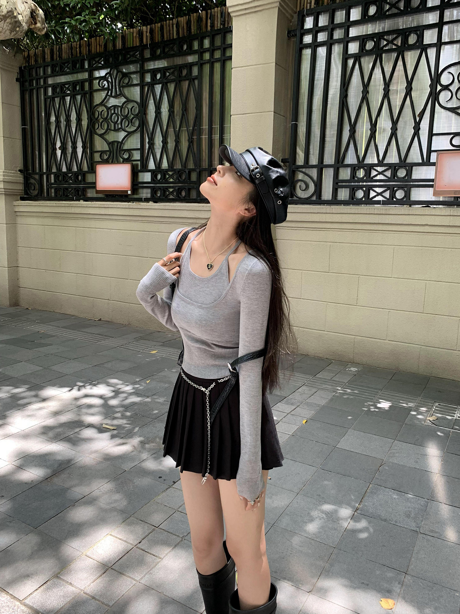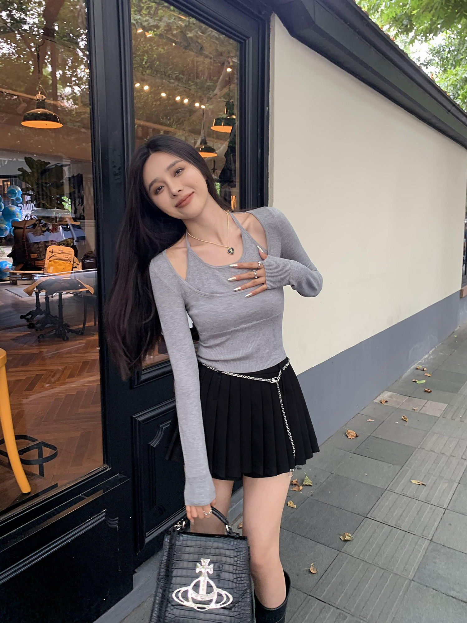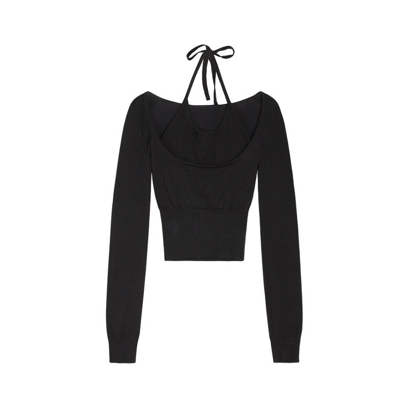 辰米范【现货5折】莱赛尔长袖挂脖假两件上衣女秋短款打底针织衫