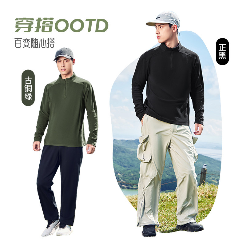 鸿星尔克长袖t恤男2025秋冬新款男士户外运动长袖半拉链加绒卫衣
