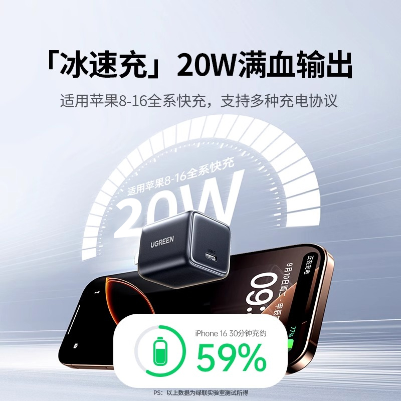 绿联氮化镓20W充电器适用苹果17air16iPhone15promax华为小米手机30W冰速充pd快充插头typec数据线套装充电头