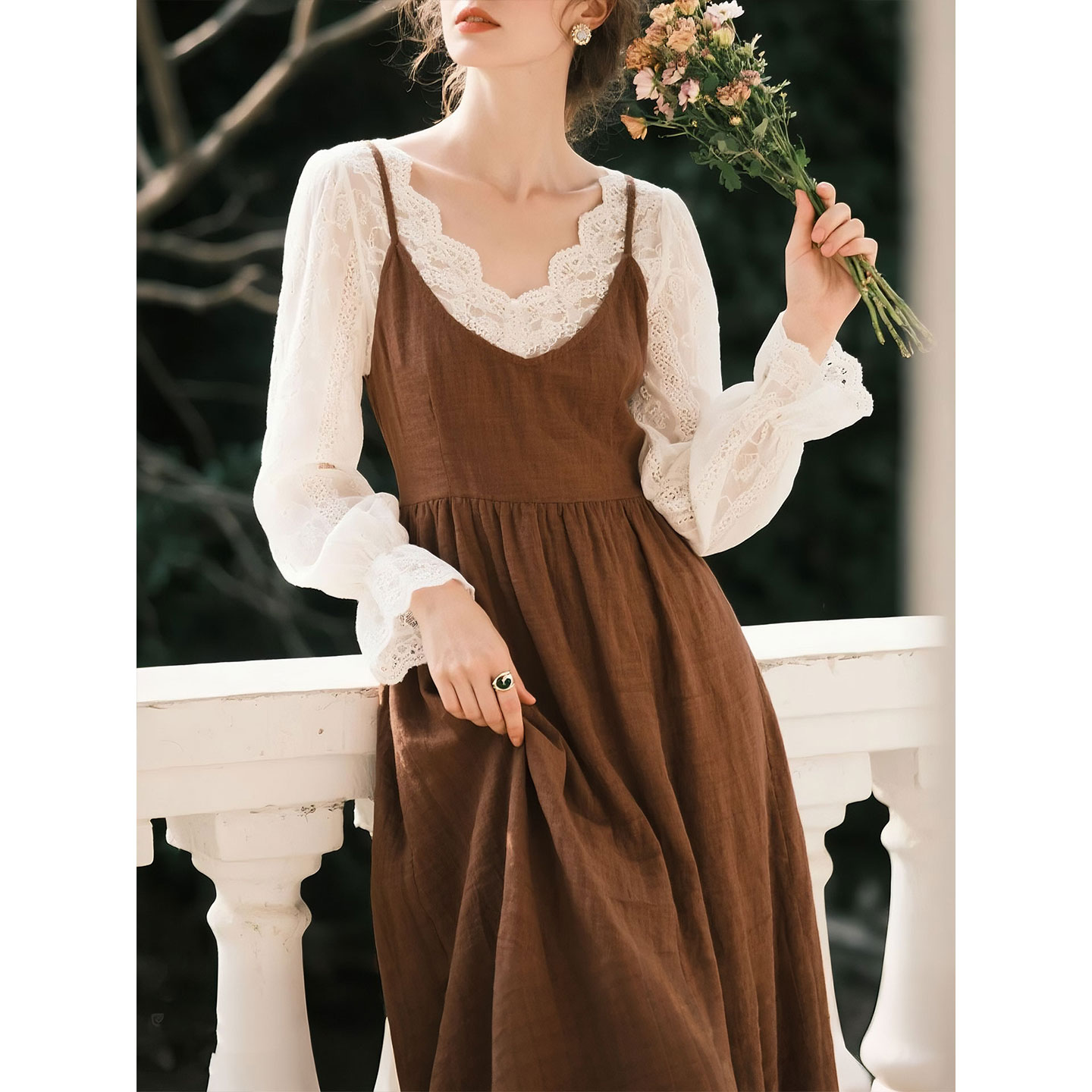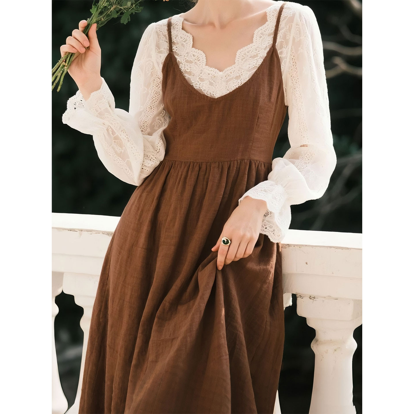 咖色亚麻吊带连衣裙搭配蕾丝上衣