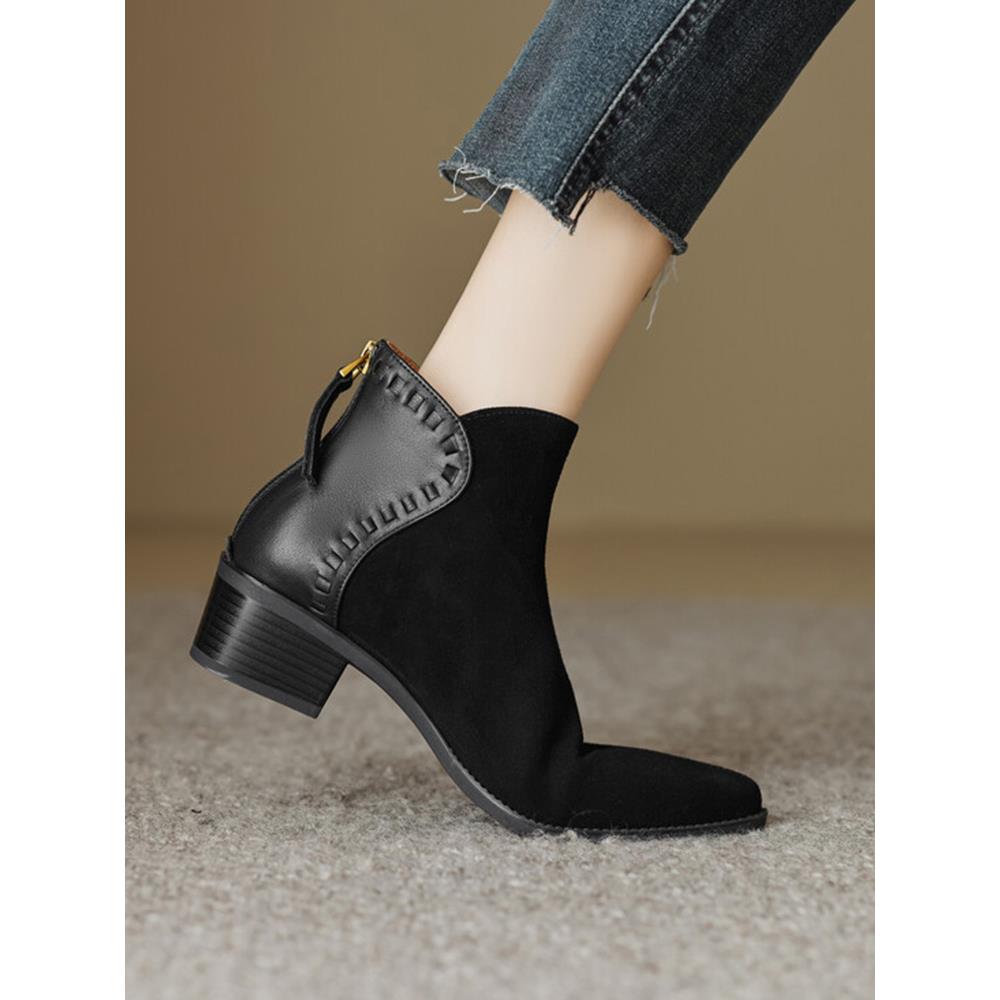 巨好穿翻毛皮短靴女靴春秋单靴尖头中跟粗跟真皮磨砂皮棕色33码40