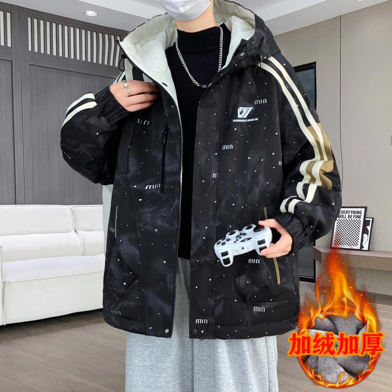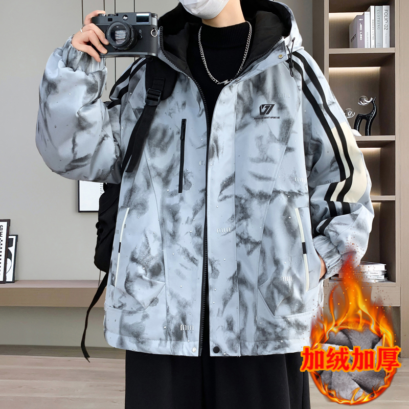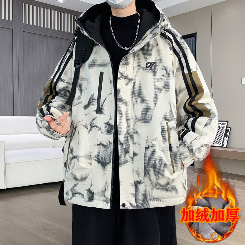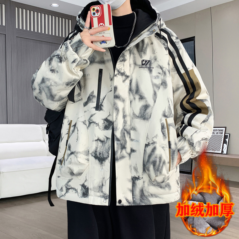 扎染外套冬季新款加绒加厚连帽夹克男款青少年潮牌休闲棉衣服以純