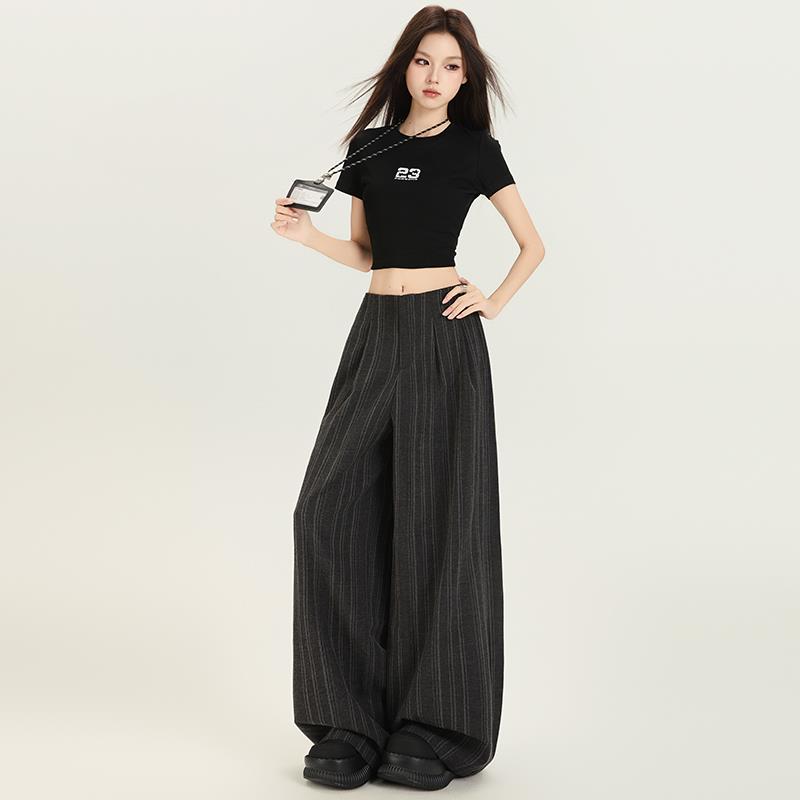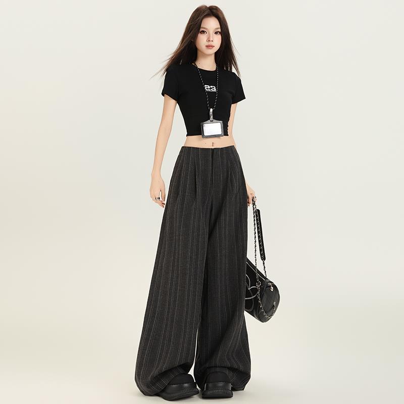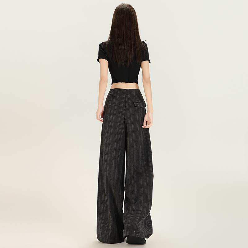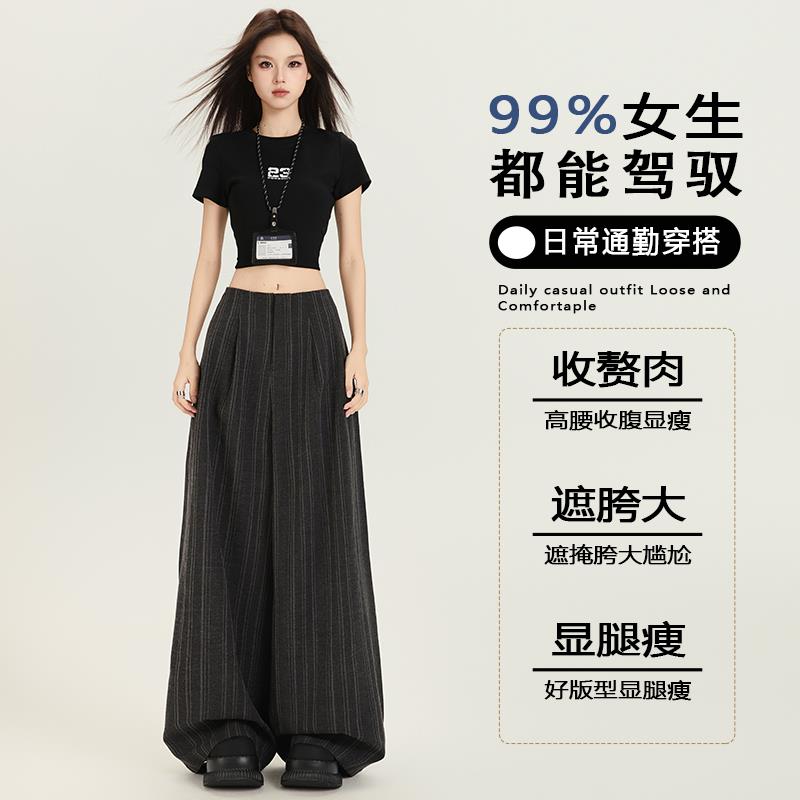 美式复古灰色条纹阔腿裤女秋季新款高腰百搭西装裤垂坠感休闲裤子
