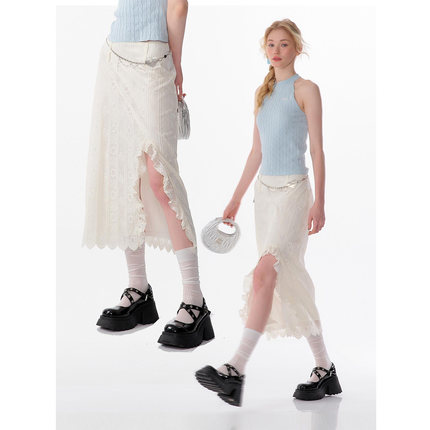 ziziFei夏新款美式高腰显瘦设计感荷叶边蕾丝开叉中长款半身裙女