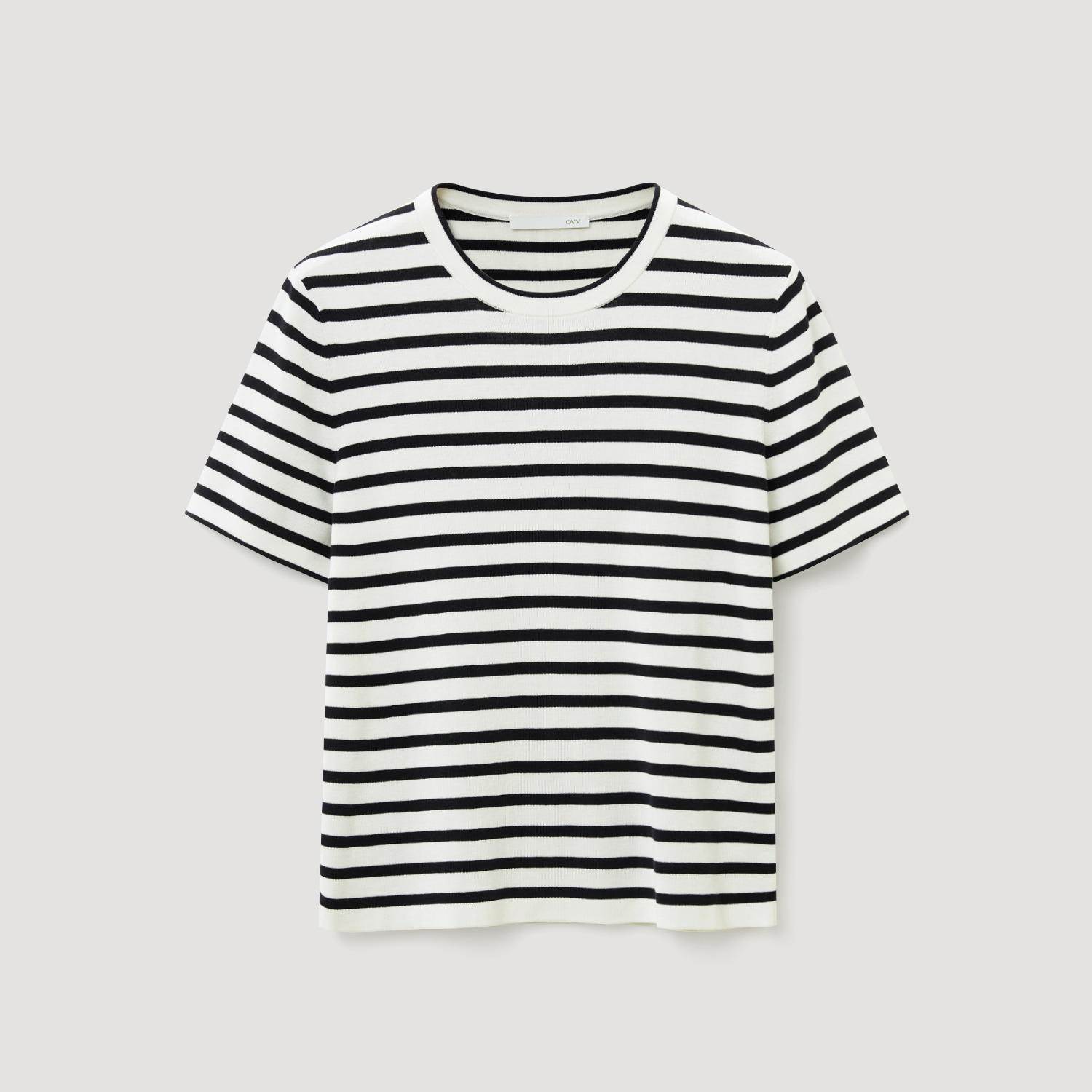 OVV春夏热卖女装丝棉混纺条纹设计圆领套头短袖针织衫