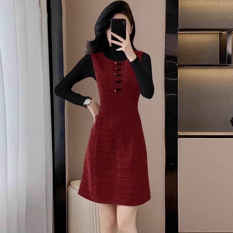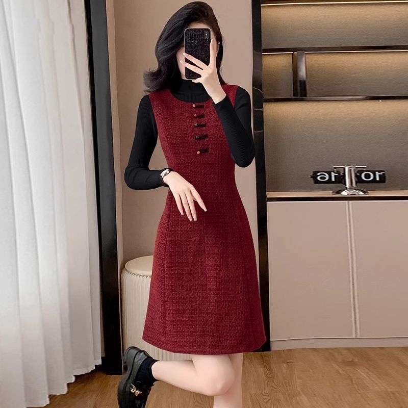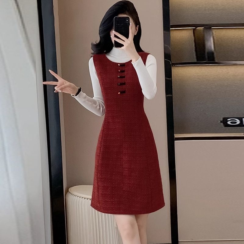 小香风毛呢修身背心连衣裙秋冬款