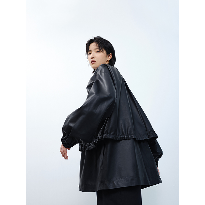MeeLeeMeeLab原创绅士优雅抽褶圆领绵羊皮斗篷式长袖宽松皮衣外套
