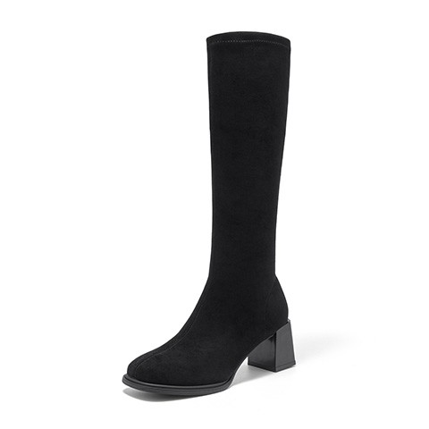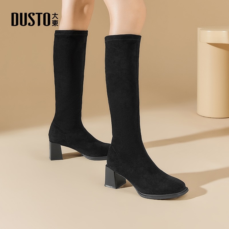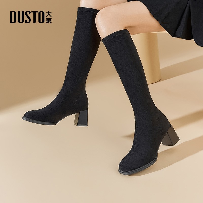 大东黑色长筒靴女秋冬2025新款弹力瘦瘦靴高筒靴绒面粗跟高跟靴子