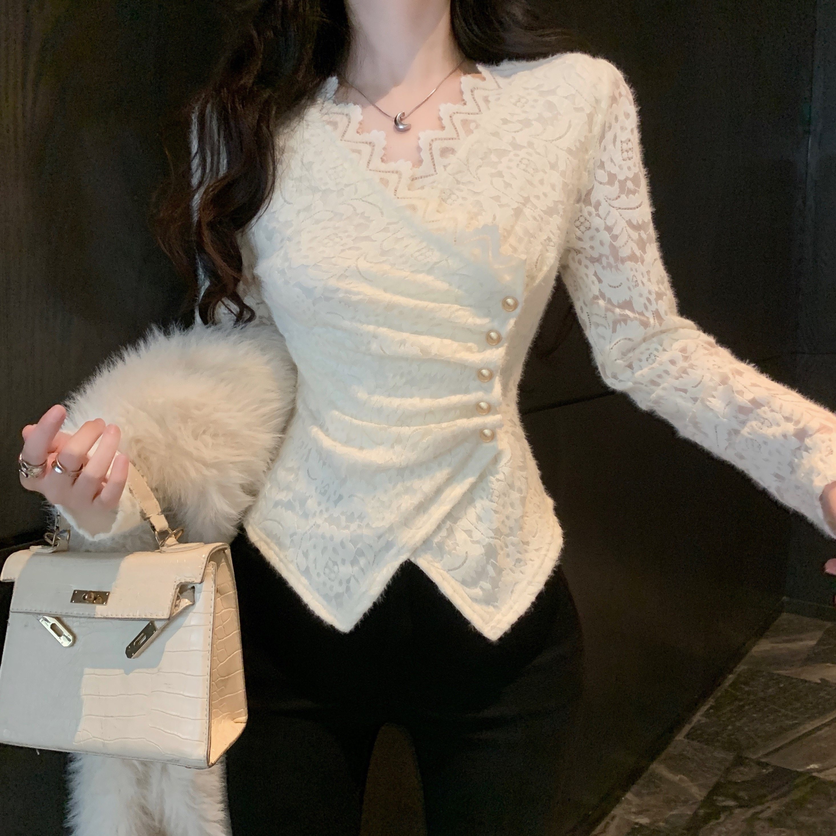 小香风宫廷风磨毛衬衫女秋冬气质独特蕾丝打底衫内搭纯欲v领上衣